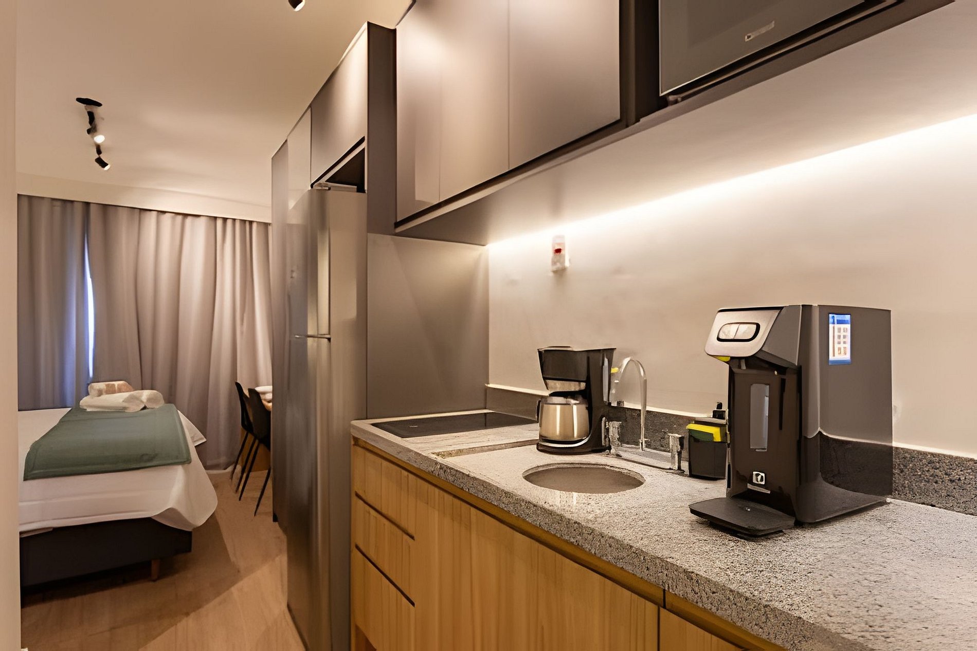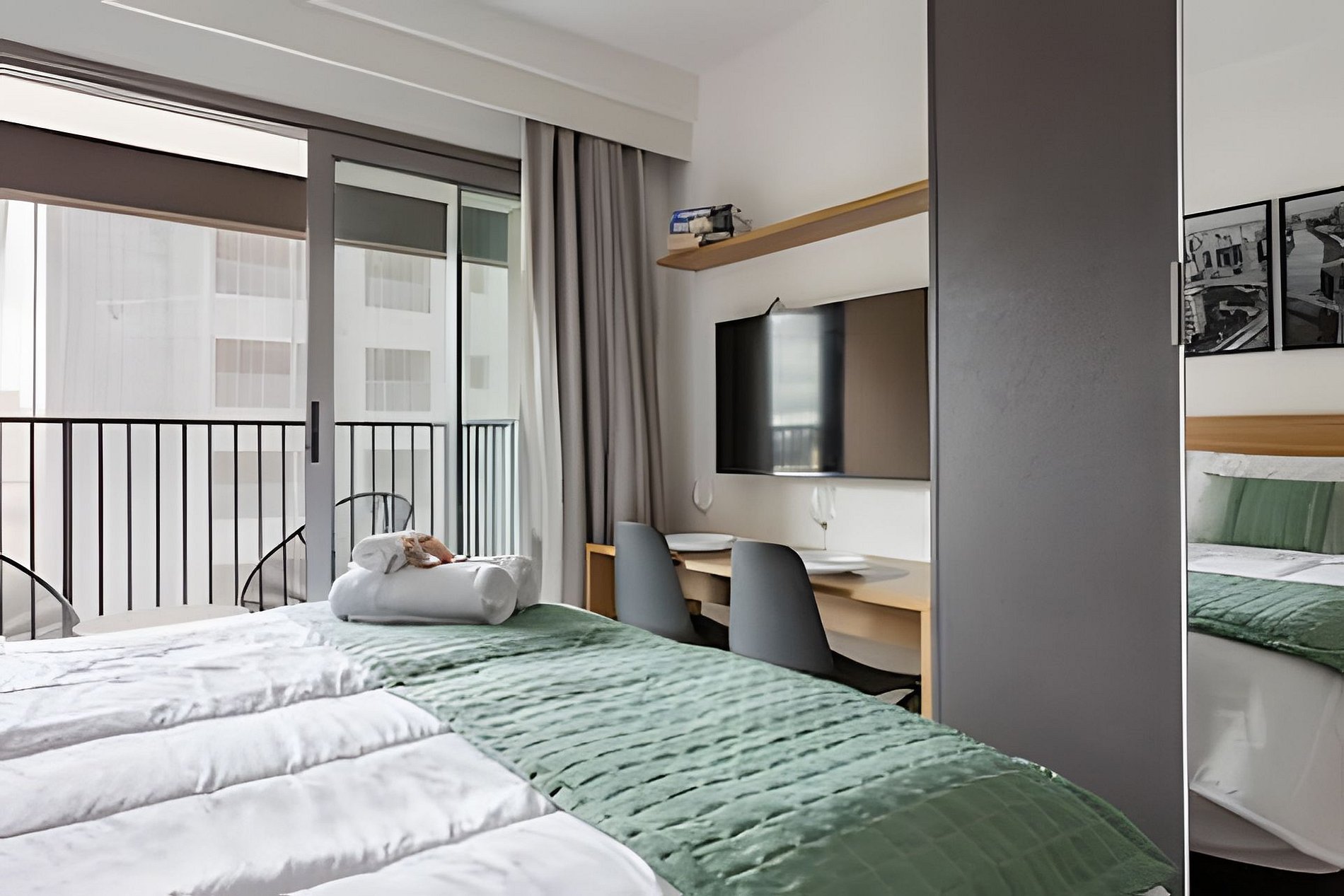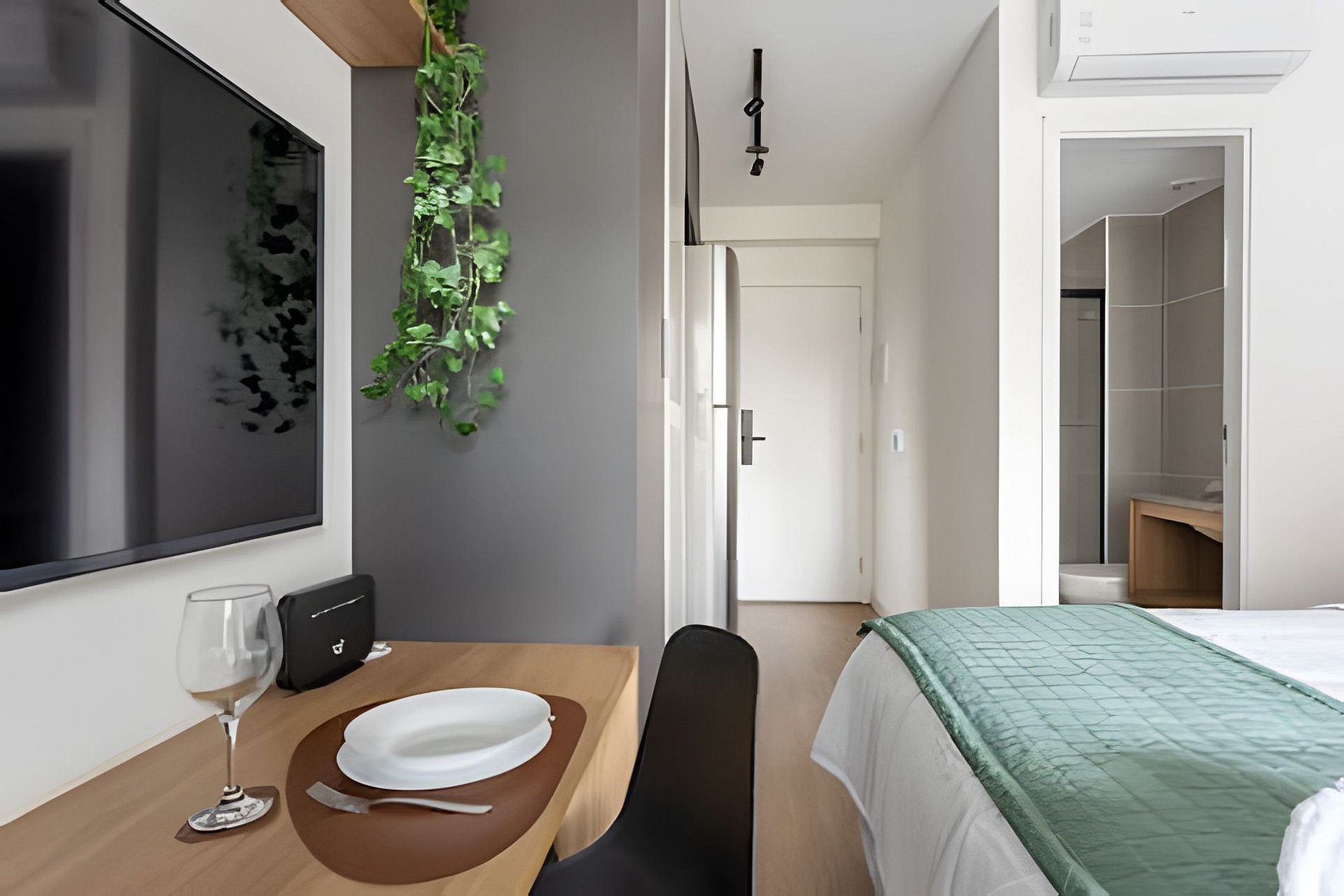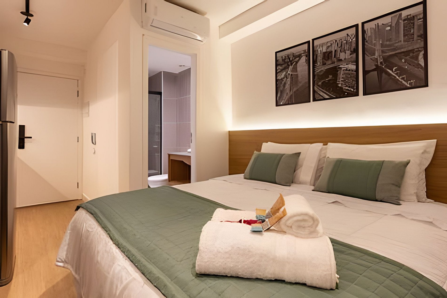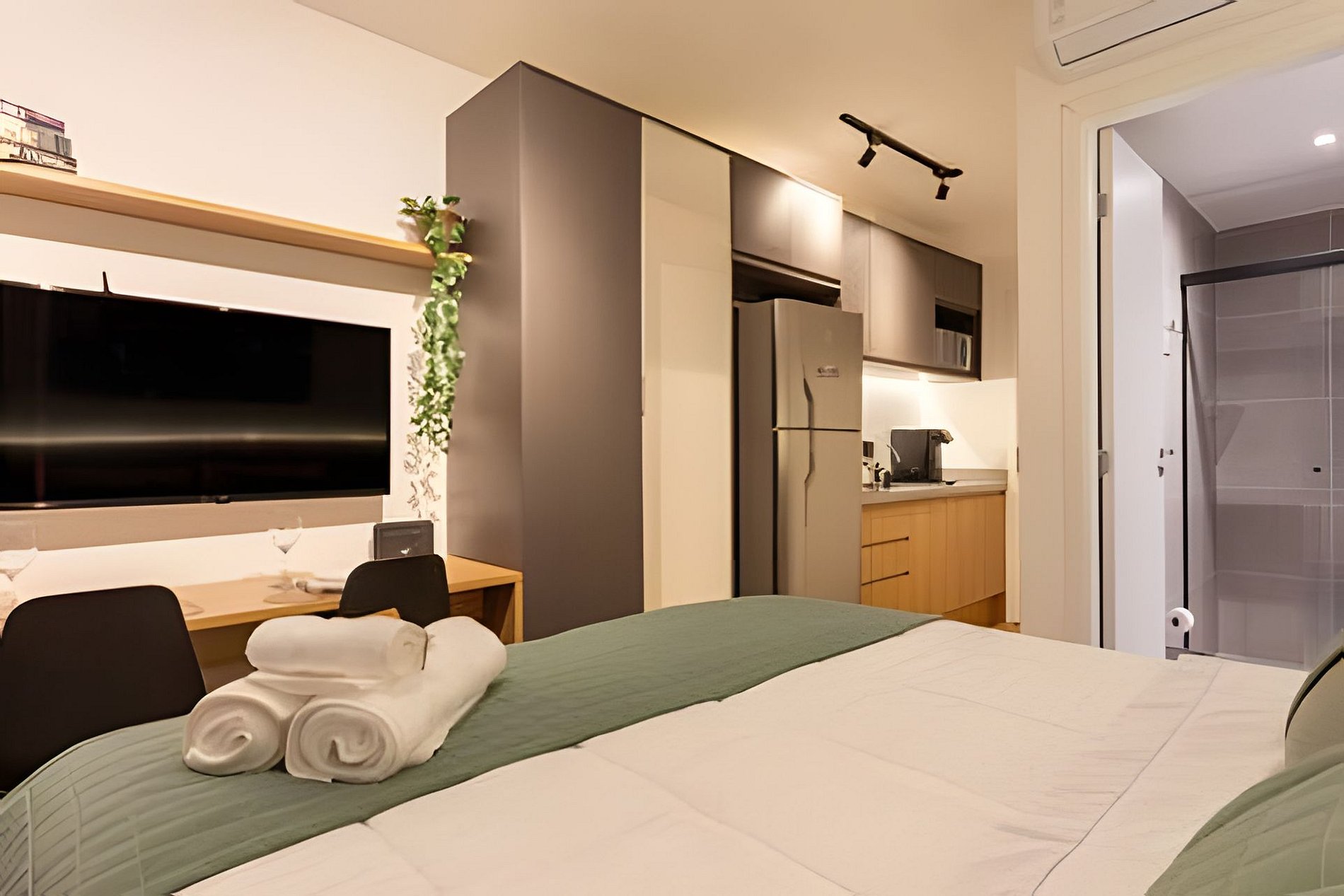Nosso studio oferece a combinação perfeita de localização e conforto, a apenas 500m do Allianz Parque. Situado em um bairro vibrante, você estará perto de tudo que precisa, desde comércio até opções de lazer. O espaço é acolhedor, com ar-condicionado, Wi-Fi de alta velocidade e cozinha equipada. Aproveite as áreas comuns, incluindo piscina e academia. Traga suas malas e desfrute de uma estadia sem preocupações!