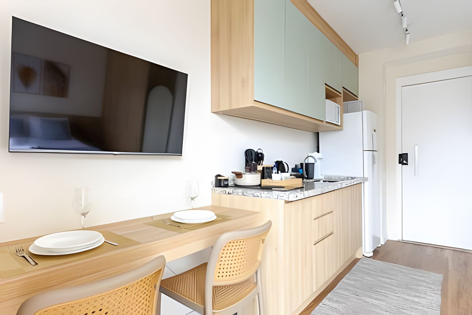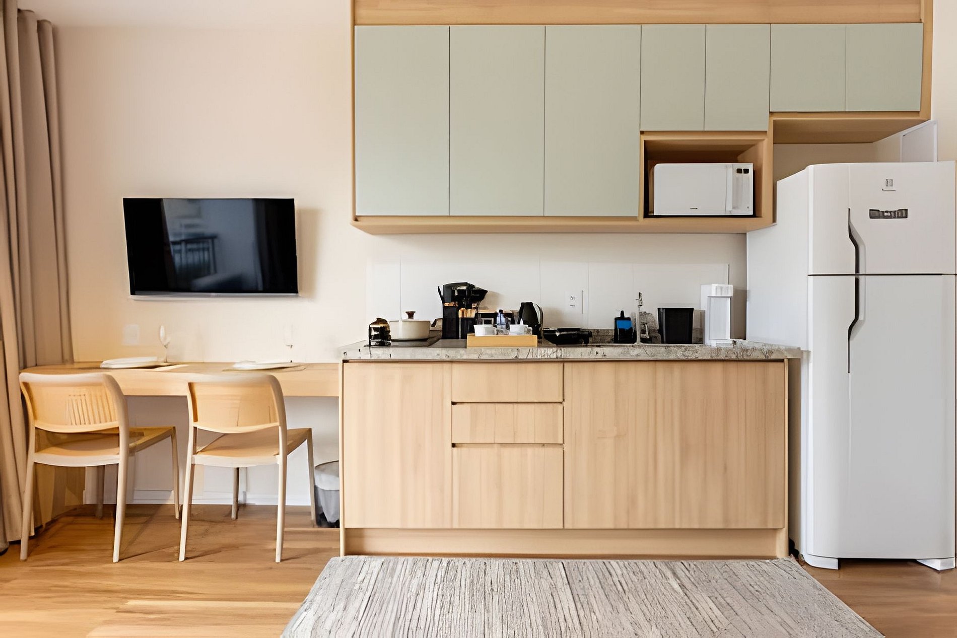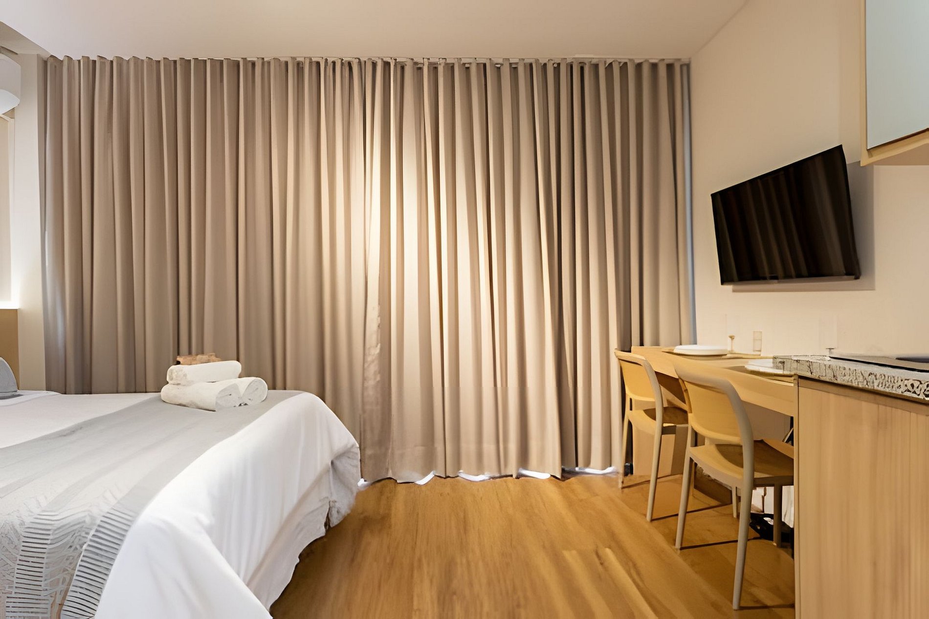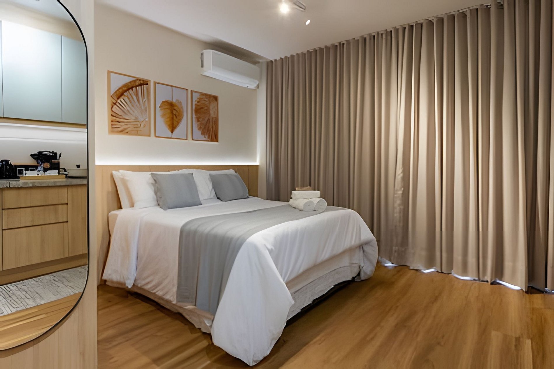 Conta com ar-condicionado, Smart TV, Wi-Fi, cozinha equipada, cafeteira, kit café/chá, secador e steamer para roupas.