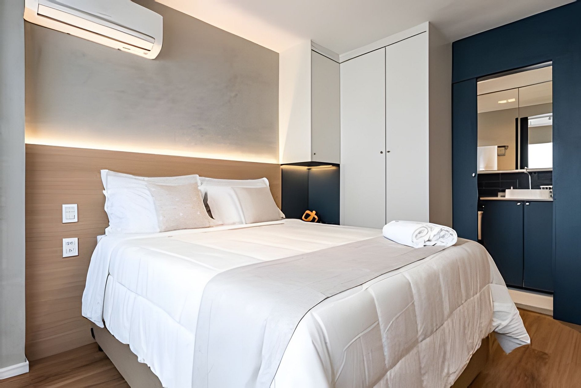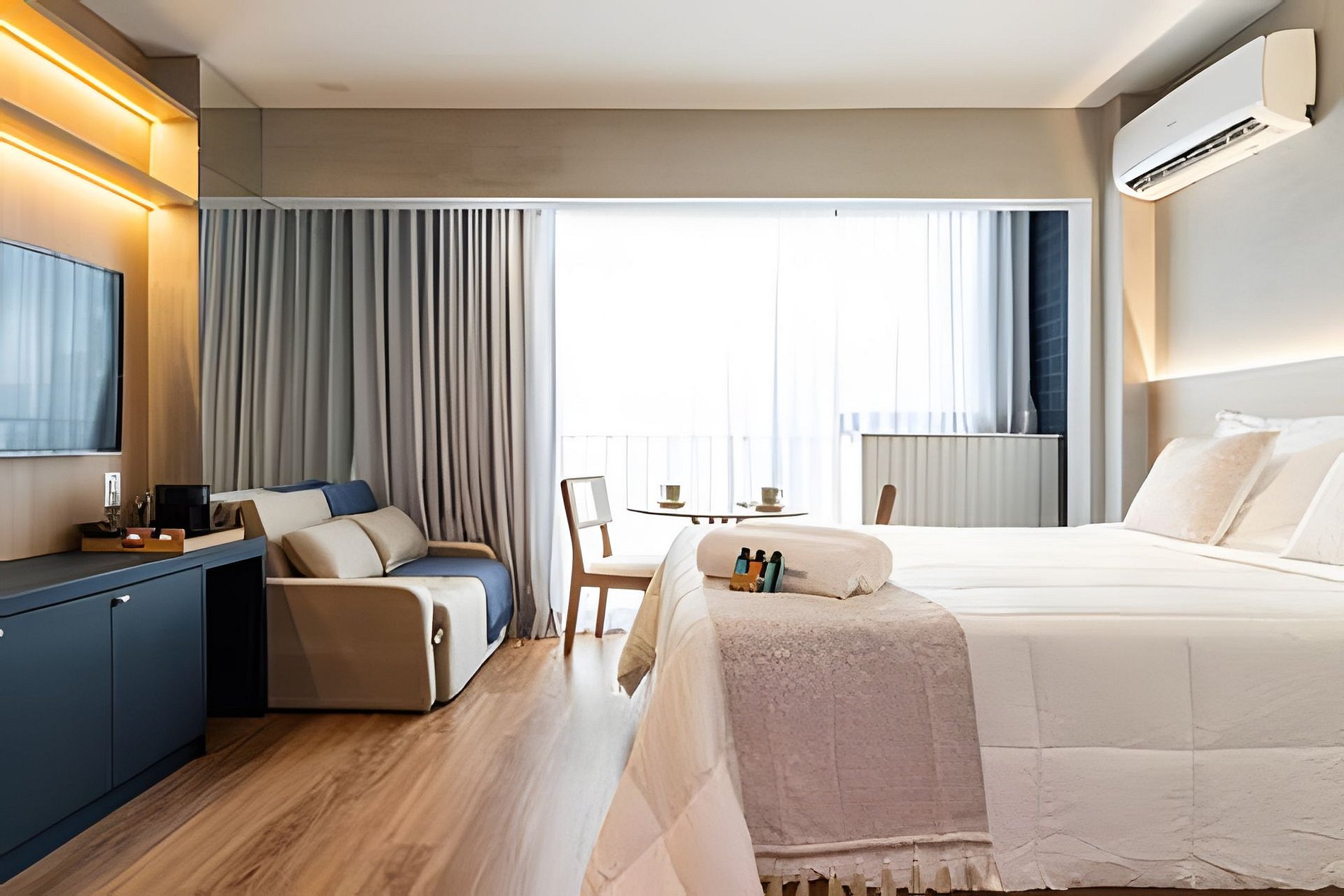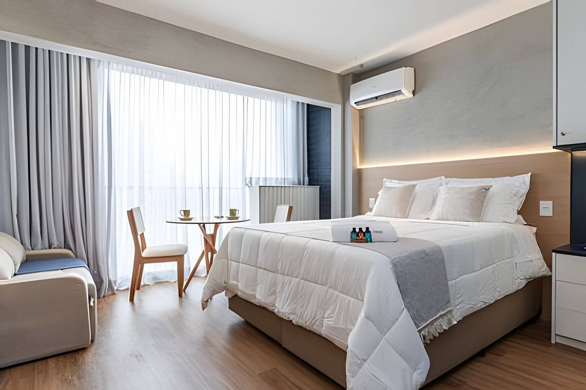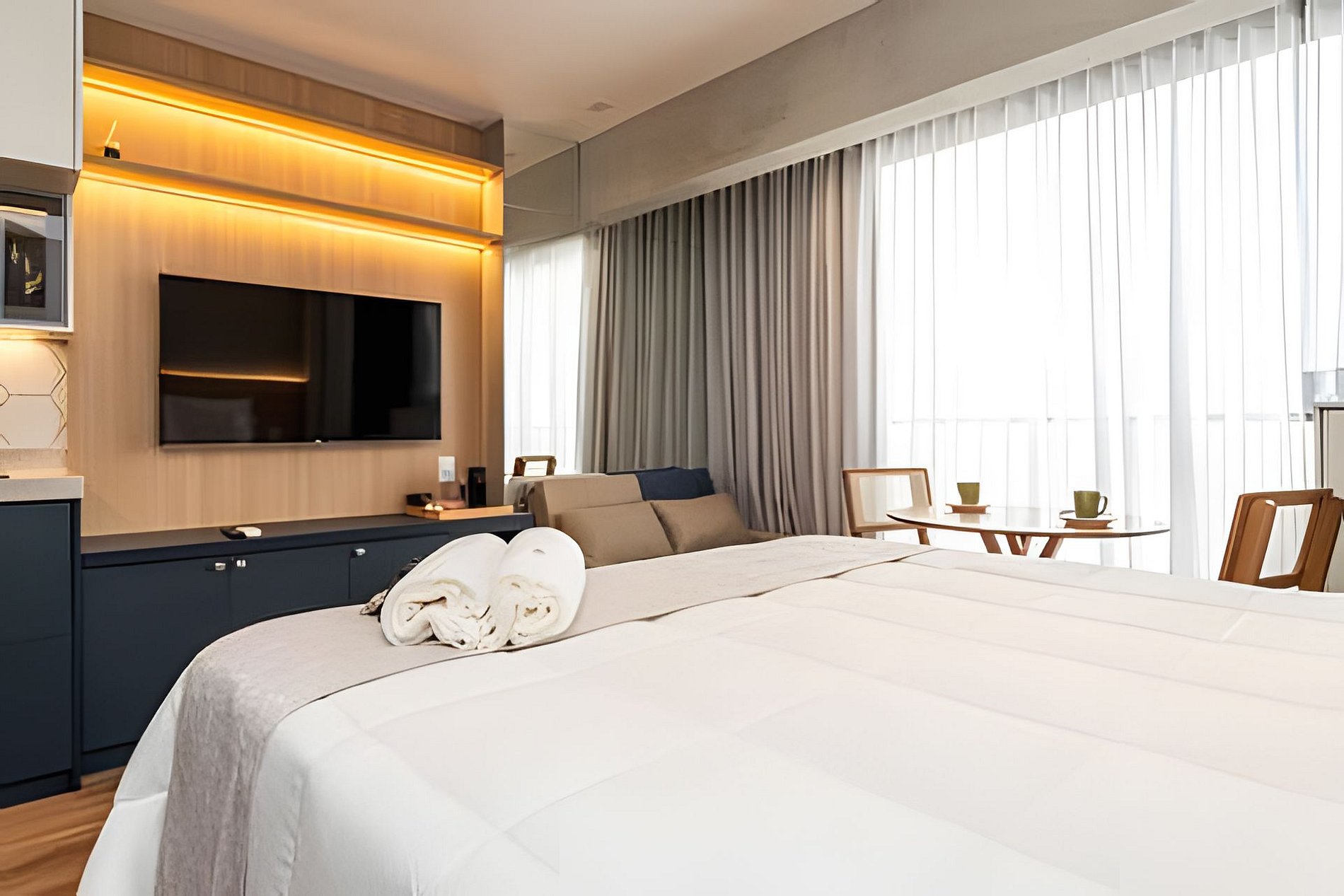 Studio moderno no 20º andar do Bourbon Smart, com cama Queen, sofá-cama e varanda estendida com vista panorâmica de Perdizes. Equipado com ar-condicionado, Smart TV, Wi-Fi, cozinha completa com cafeteira e kit café/chá, além de secador e steamer para roupas. Acesso a piscina, academia e coworking. Roupa de cama e amenities inclusos. Próximo ao Allianz Parque, restaurantes e Shoppings