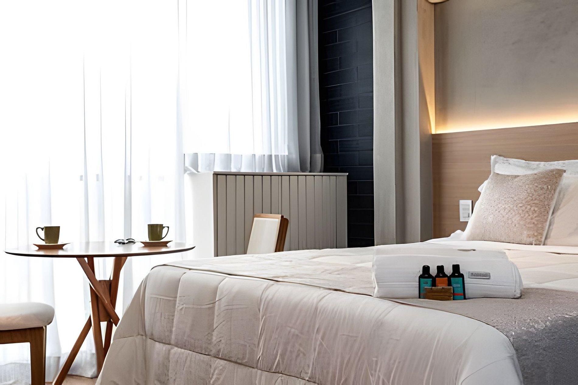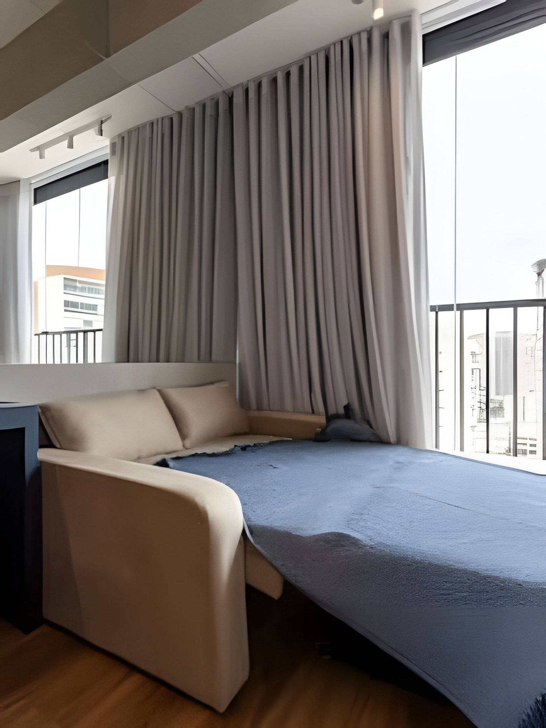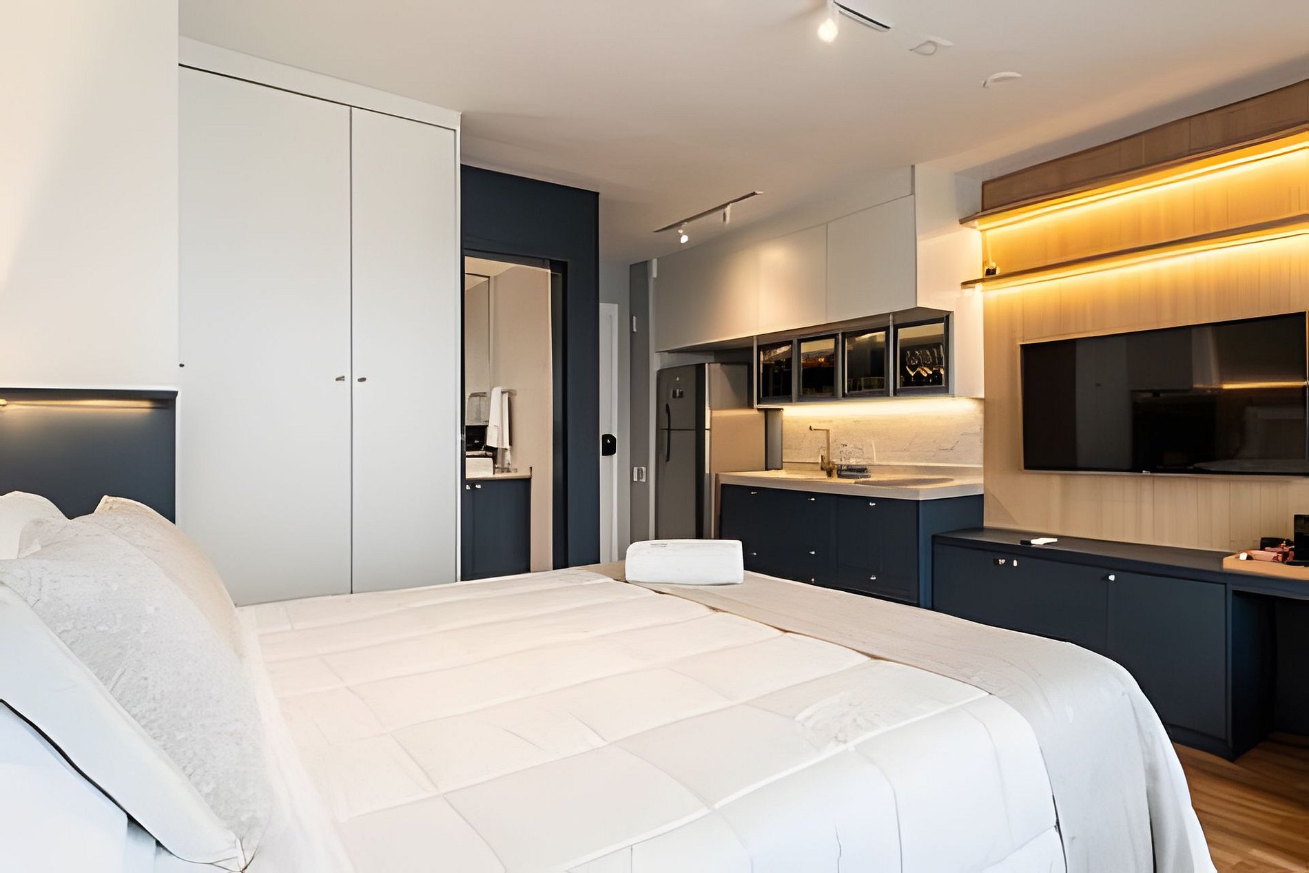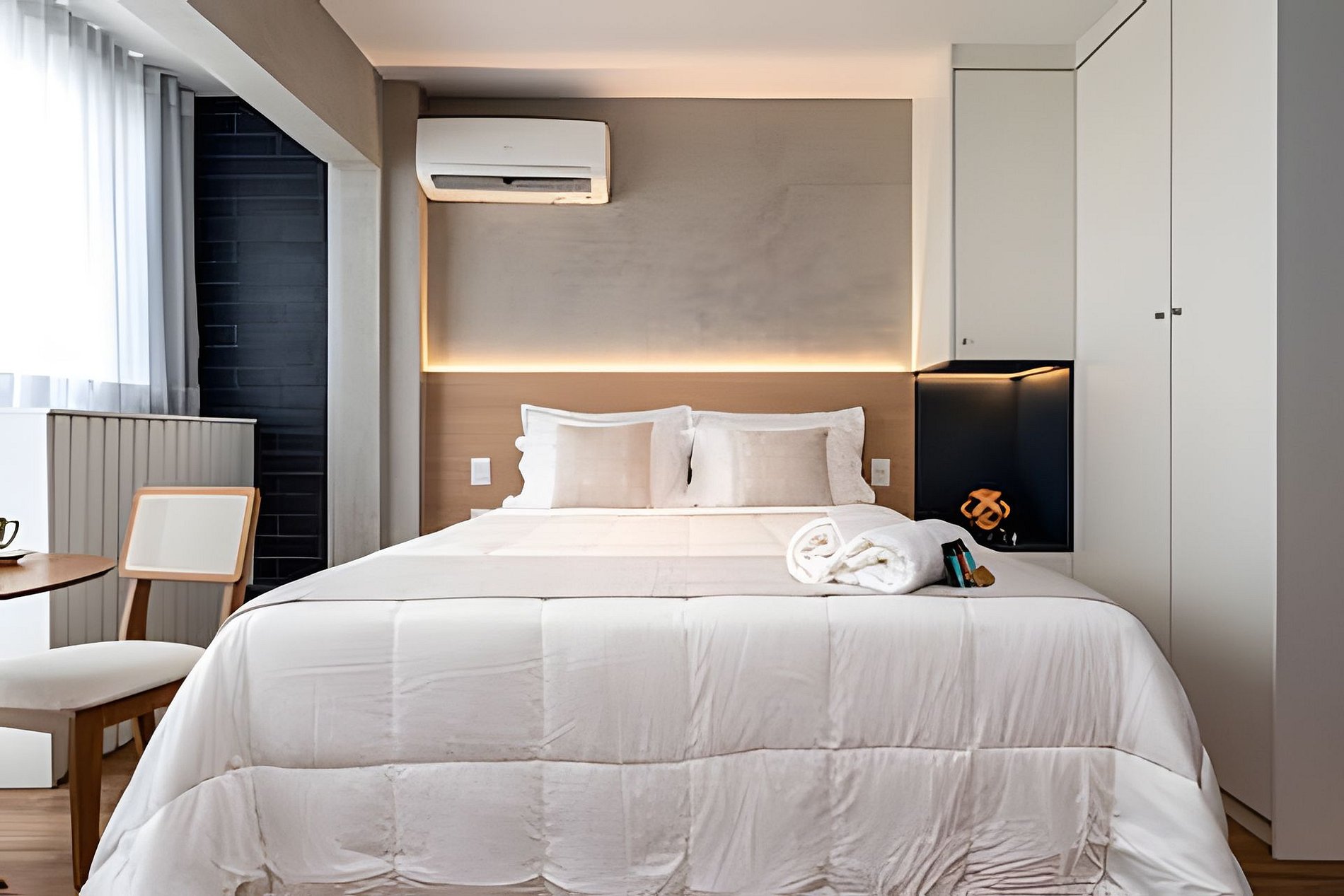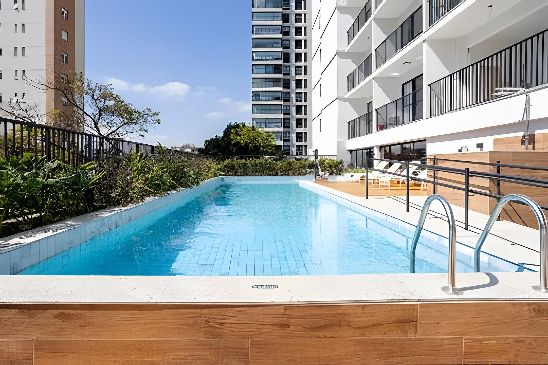Studio moderno no 20º andar do Bourbon Smart, com cama Queen, sofá-cama e varanda estendida com vista panorâmica de Perdizes. Equipado com ar-condicionado, Smart TV, Wi-Fi, cozinha completa com cafeteira e kit café/chá, além de secador e steamer para roupas. Acesso a piscina, academia e coworking. Roupa de cama e amenities inclusos. Próximo ao Allianz Parque, restaurantes e Shoppings