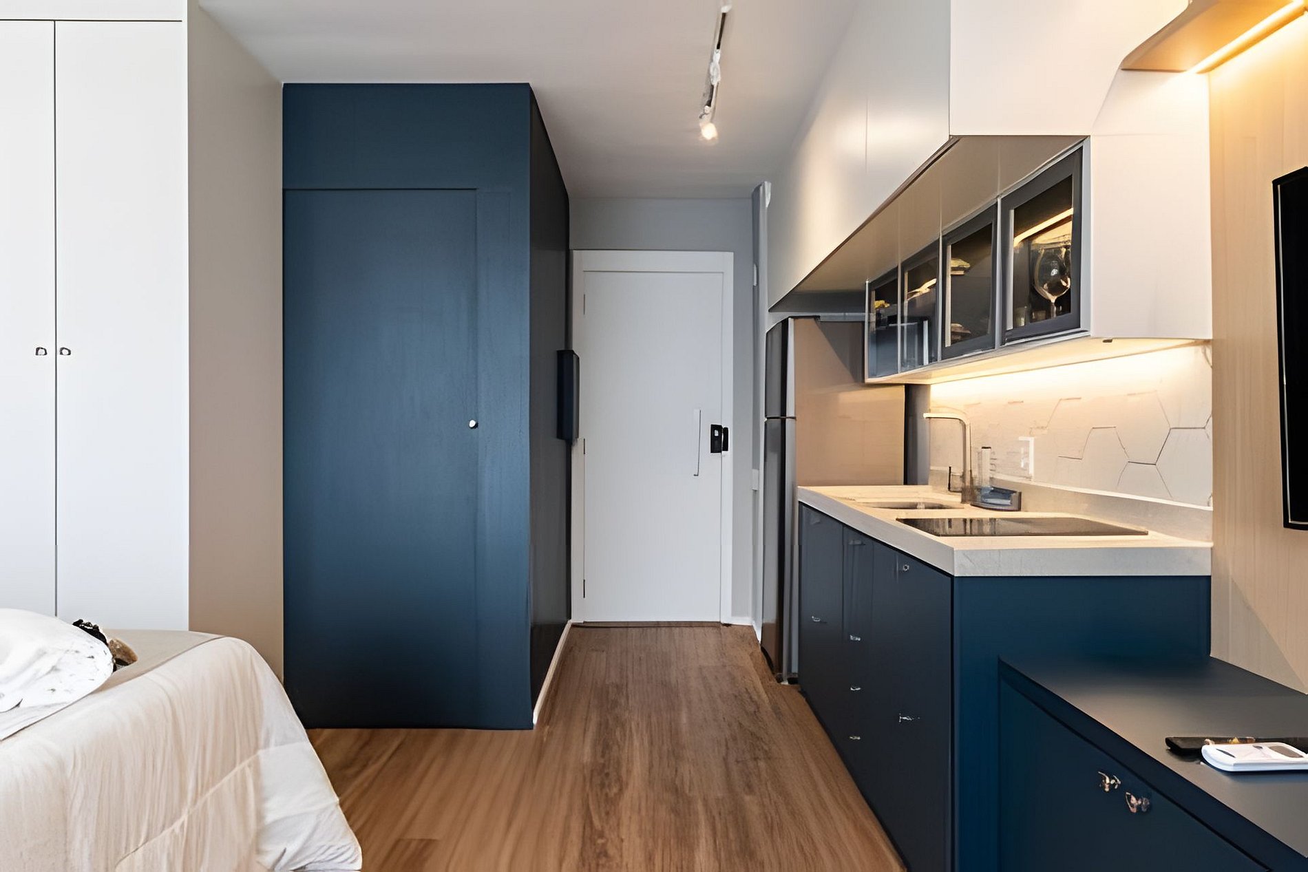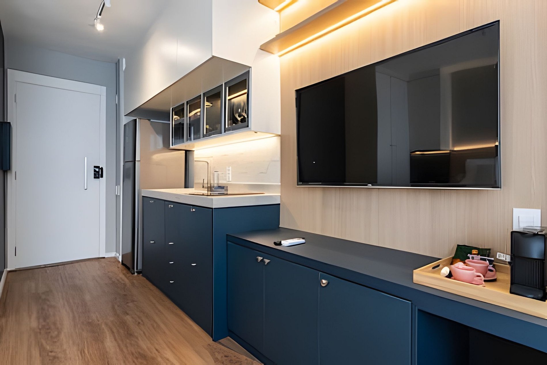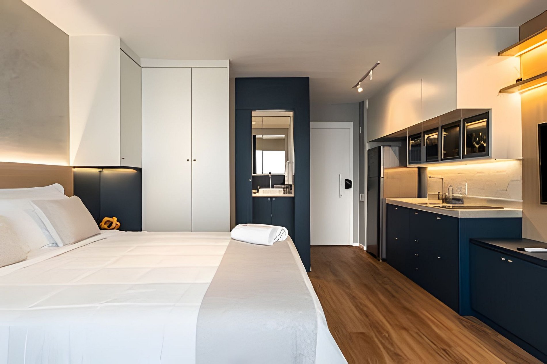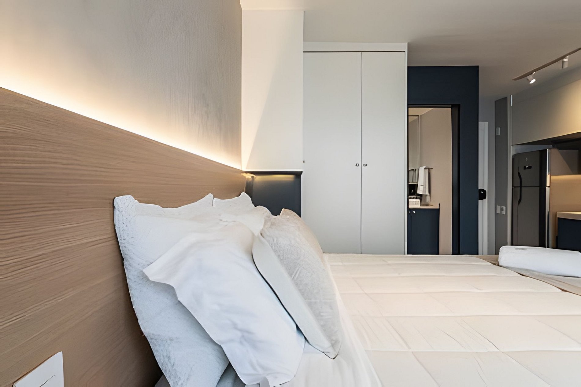 Studio moderno no 20º andar do Bourbon Smart, com cama Queen, sofá-cama e varanda estendida com vista panorâmica de Perdizes. Equipado com ar-condicionado, Smart TV, Wi-Fi, cozinha completa com cafeteira e kit café/chá, além de secador e steamer para roupas. Acesso a piscina, academia e coworking. Roupa de cama e amenities inclusos. Próximo ao Allianz Parque, restaurantes e Shoppings