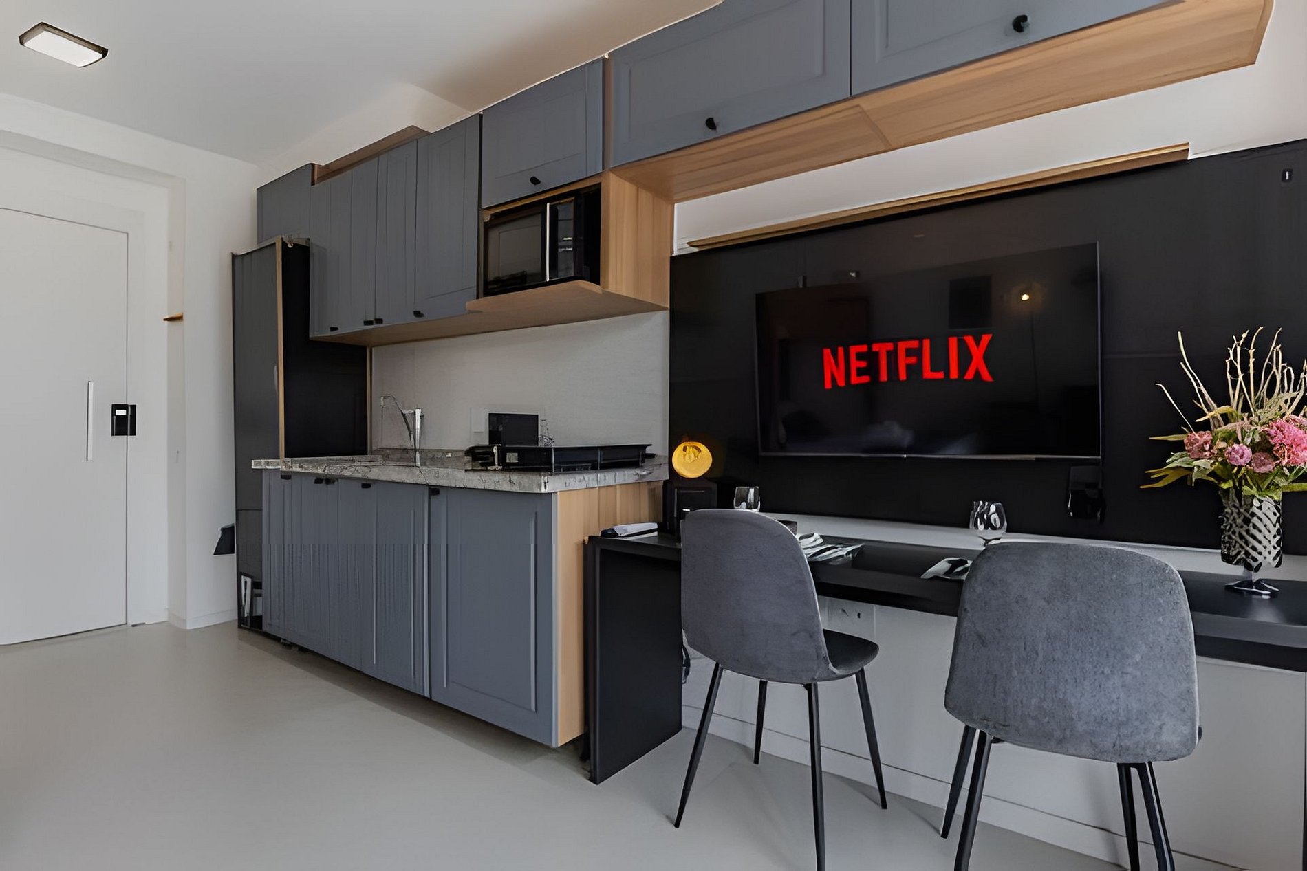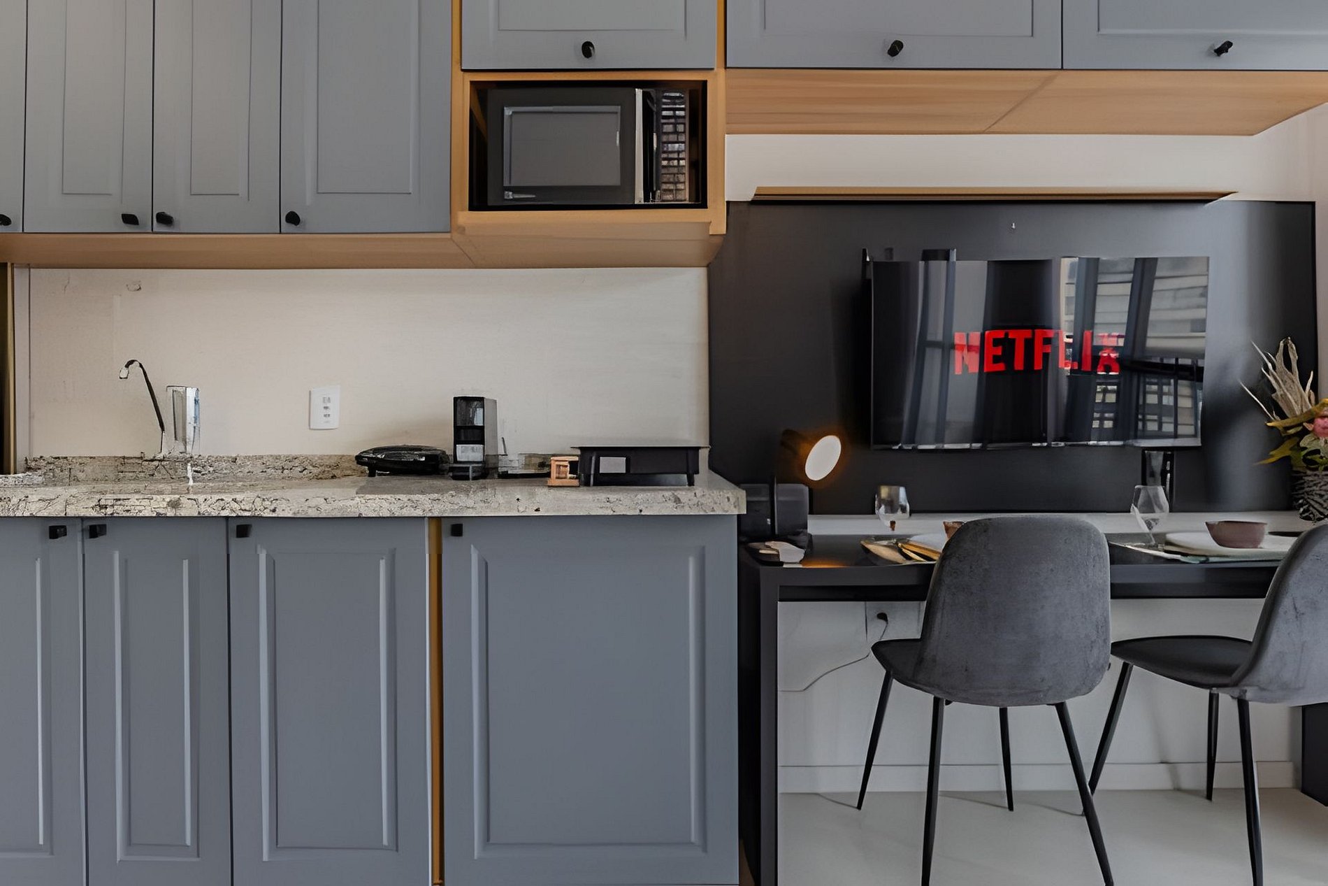 Conta com ar-condicionado, Smart TV, Wi-Fi, cozinha equipada, cafeteira, kit café/chá.