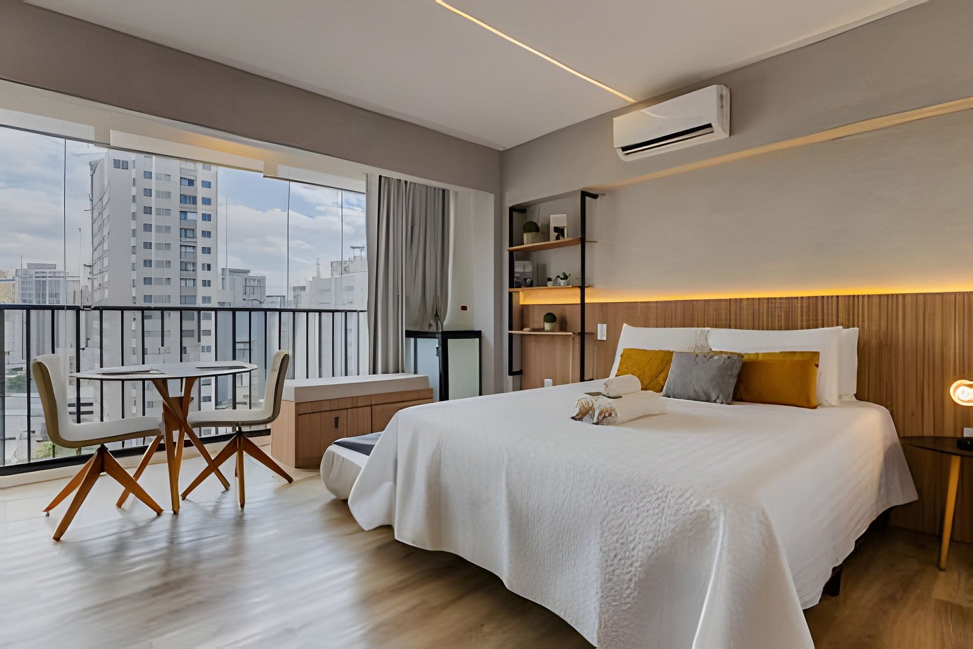 Apto moderno no 17º andar do Bourbon Smart, com cama Queen e Bi-cama, varanda estendida e bela vista do Bairro de Perdizes. Conta com ar-condicionado, Smart TV, Wi-Fi, cozinha equipada, cafeteira, kit café/chá, secador e steamer para roupas. Acesso à piscina, academia, coworking. Roupa de cama e amenities inclusos. Próximo ao Allianz Parque!
