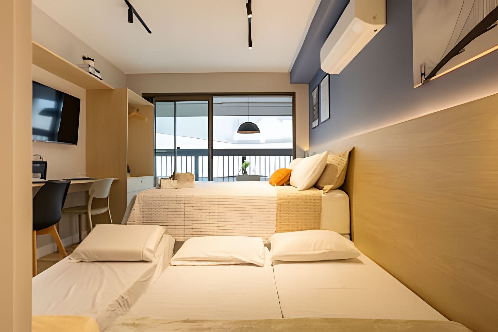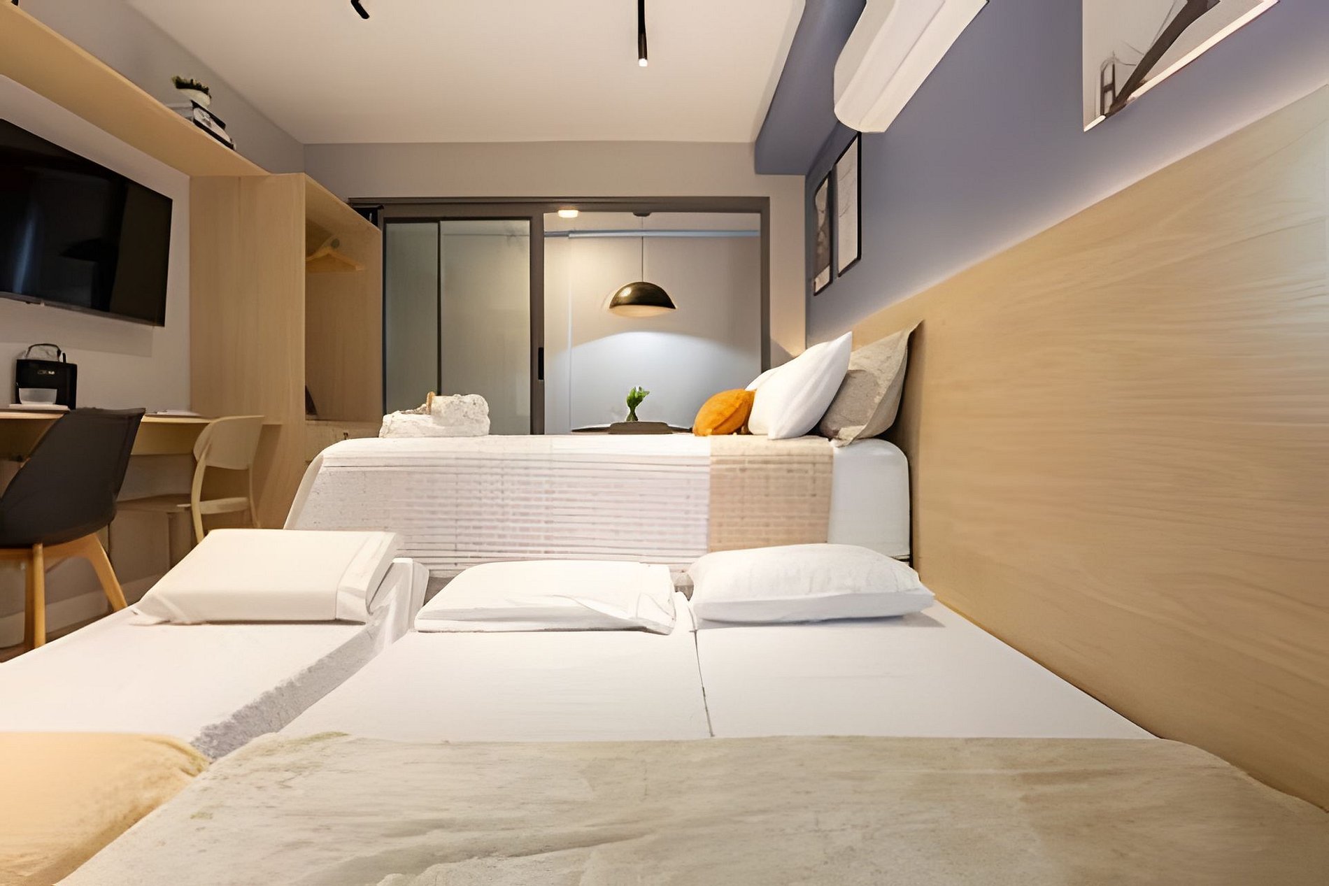 Apto moderno no 1º andar do Nik Perdizes, com cama Queen e sofá-cama-Casal e uma Poltrona-Cama-Solteiro, atendendo até 5 pessoas na unidade. (Poltrona-Cama é facilmente convertida em Cama pelo Hospede, deixamos no "modo"Poltrona para melhor circulação.