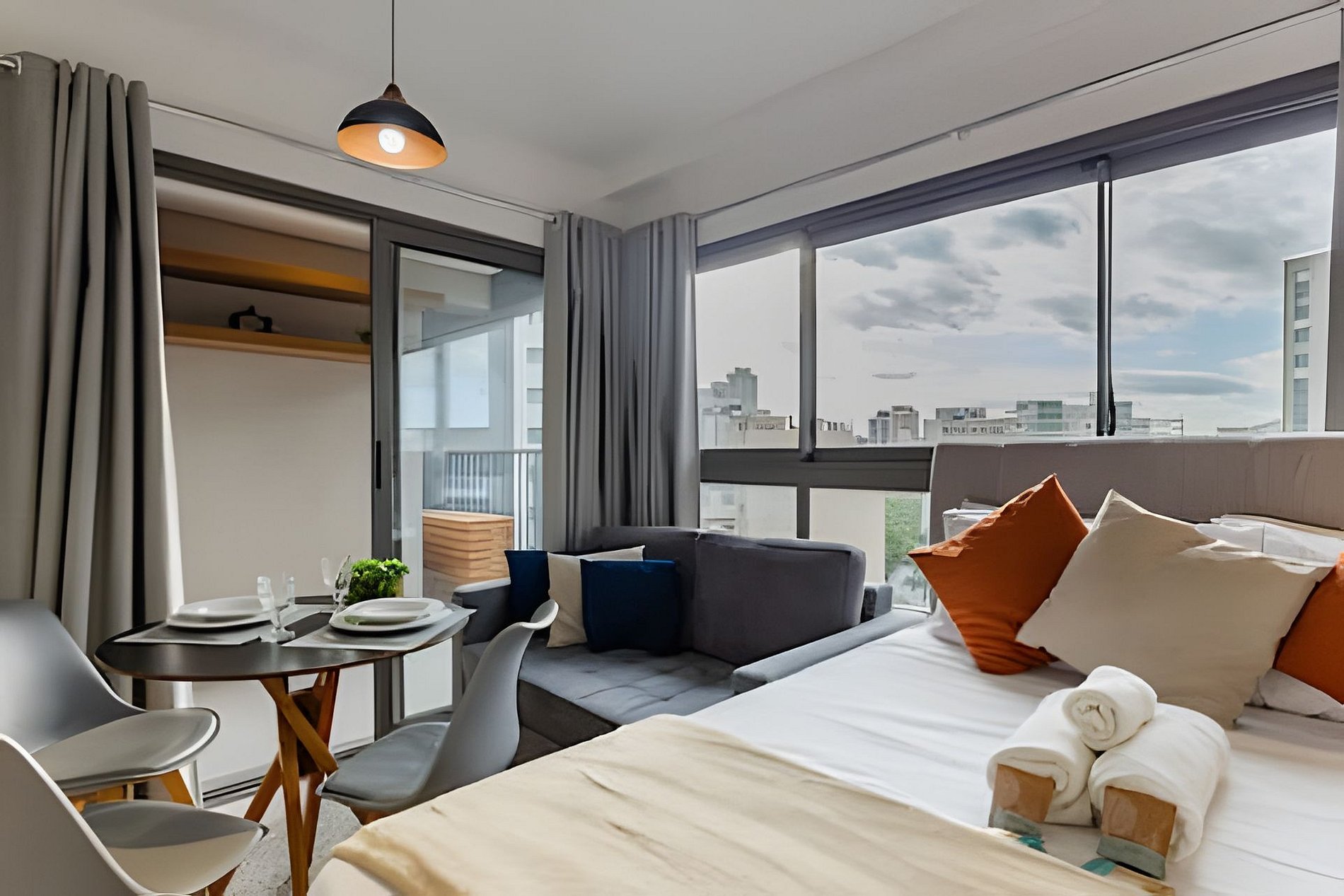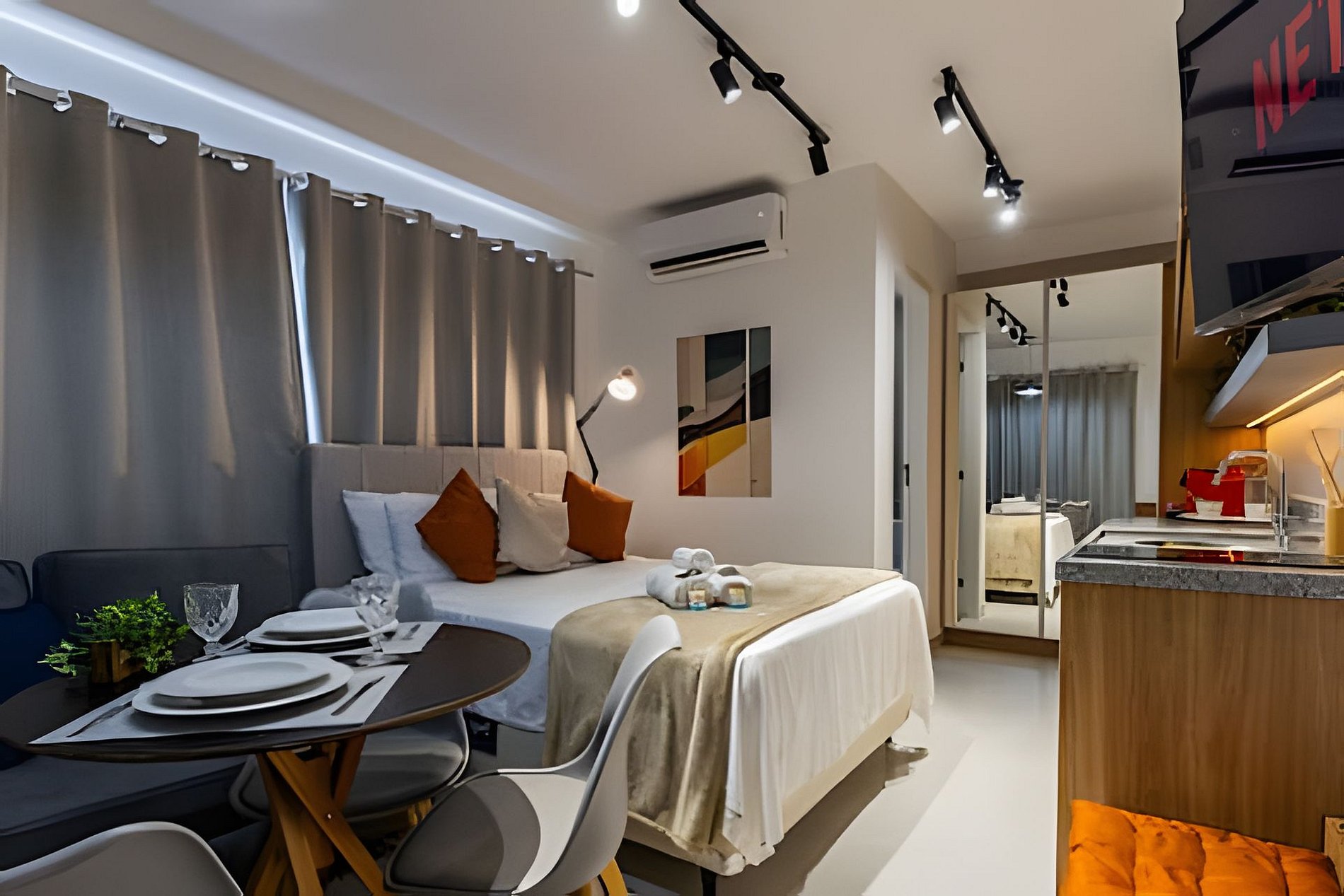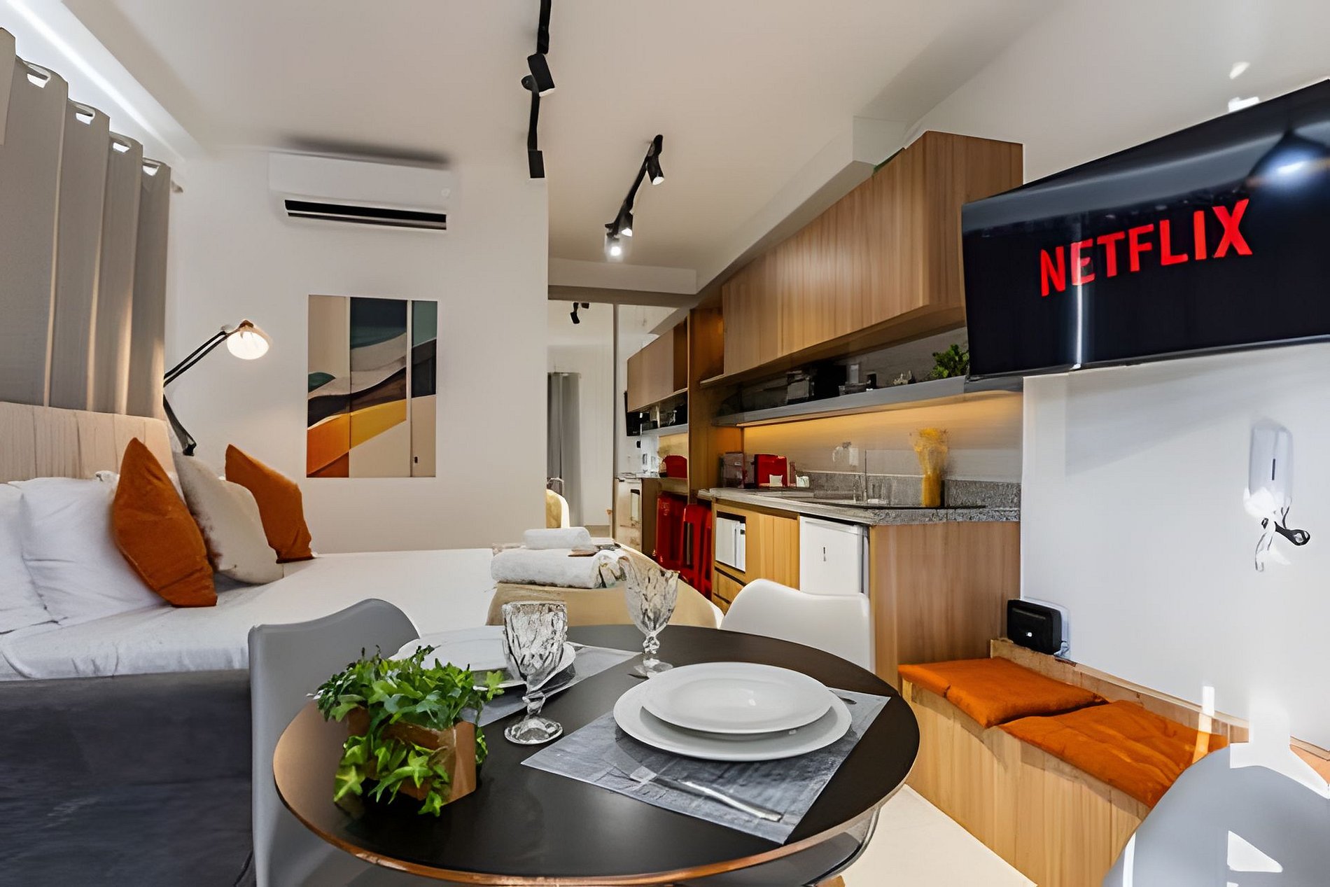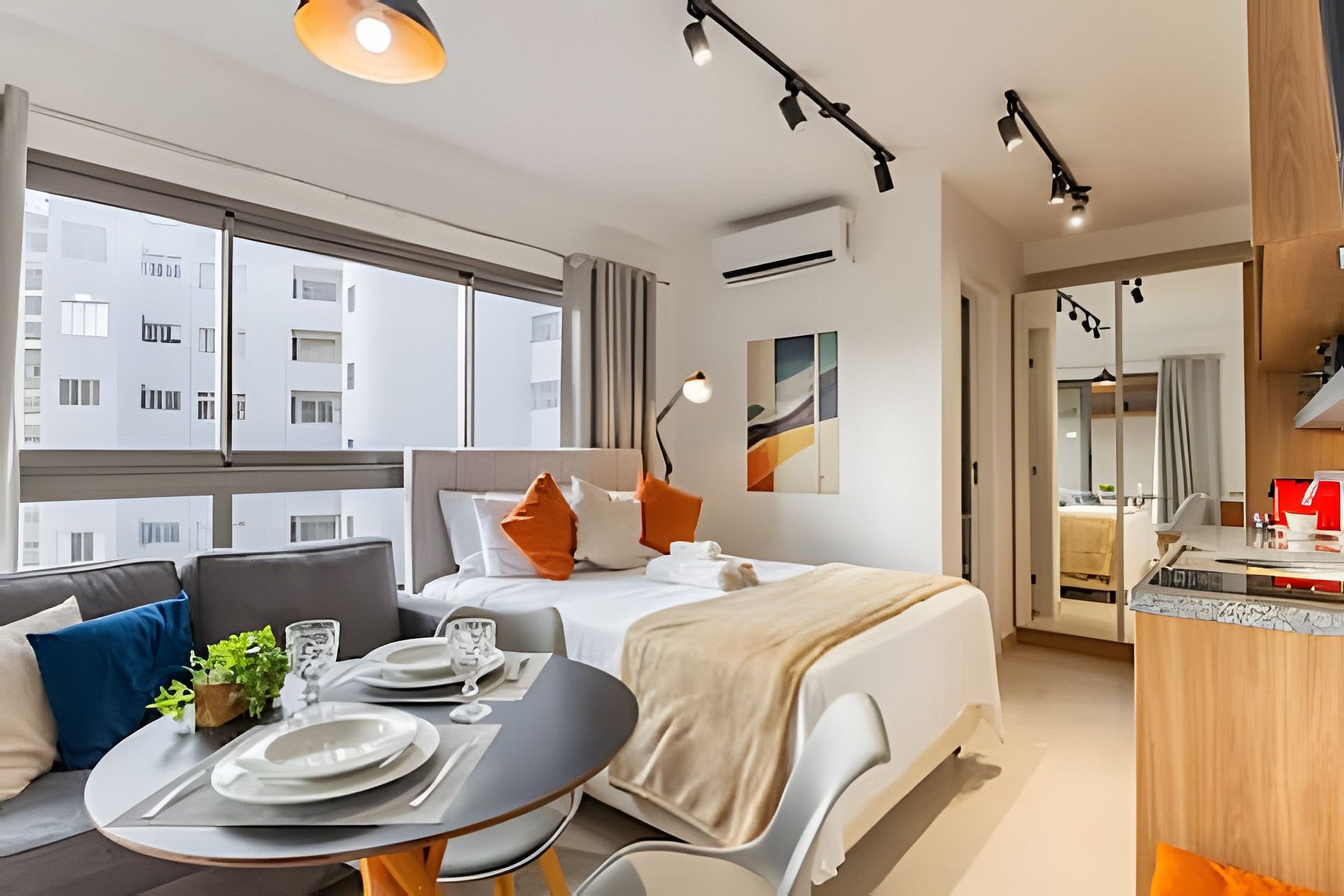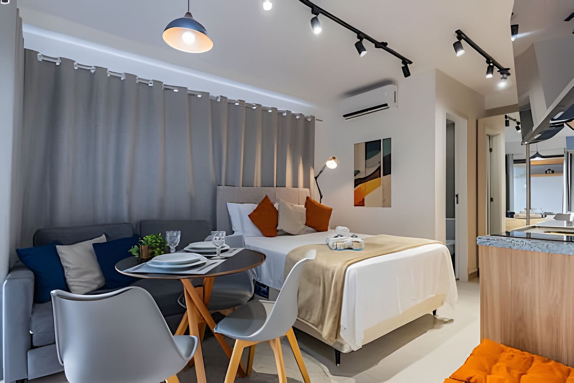Nosso studio oferece a combinação perfeita de localização e conforto, a apenas 500m do Allianz Parque. Situado em um bairro vibrante, você estará perto de tudo que precisa, desde comércio até opções de lazer. O espaço é acolhedor, com ar-condicionado, Wi-Fi de alta velocidade e cozinha equipada. Aproveite as áreas comuns, incluindo piscina e academia. Traga suas malas e desfrute de uma estadia sem preocupações!