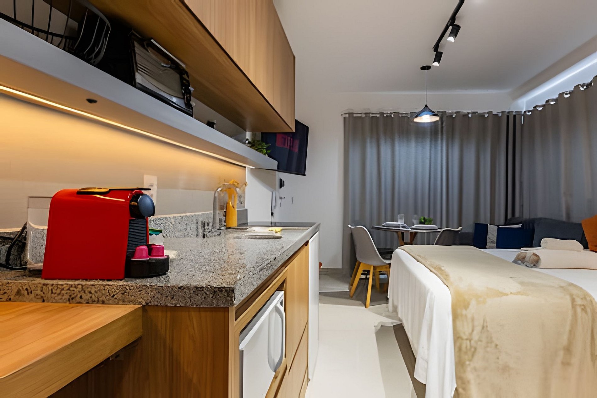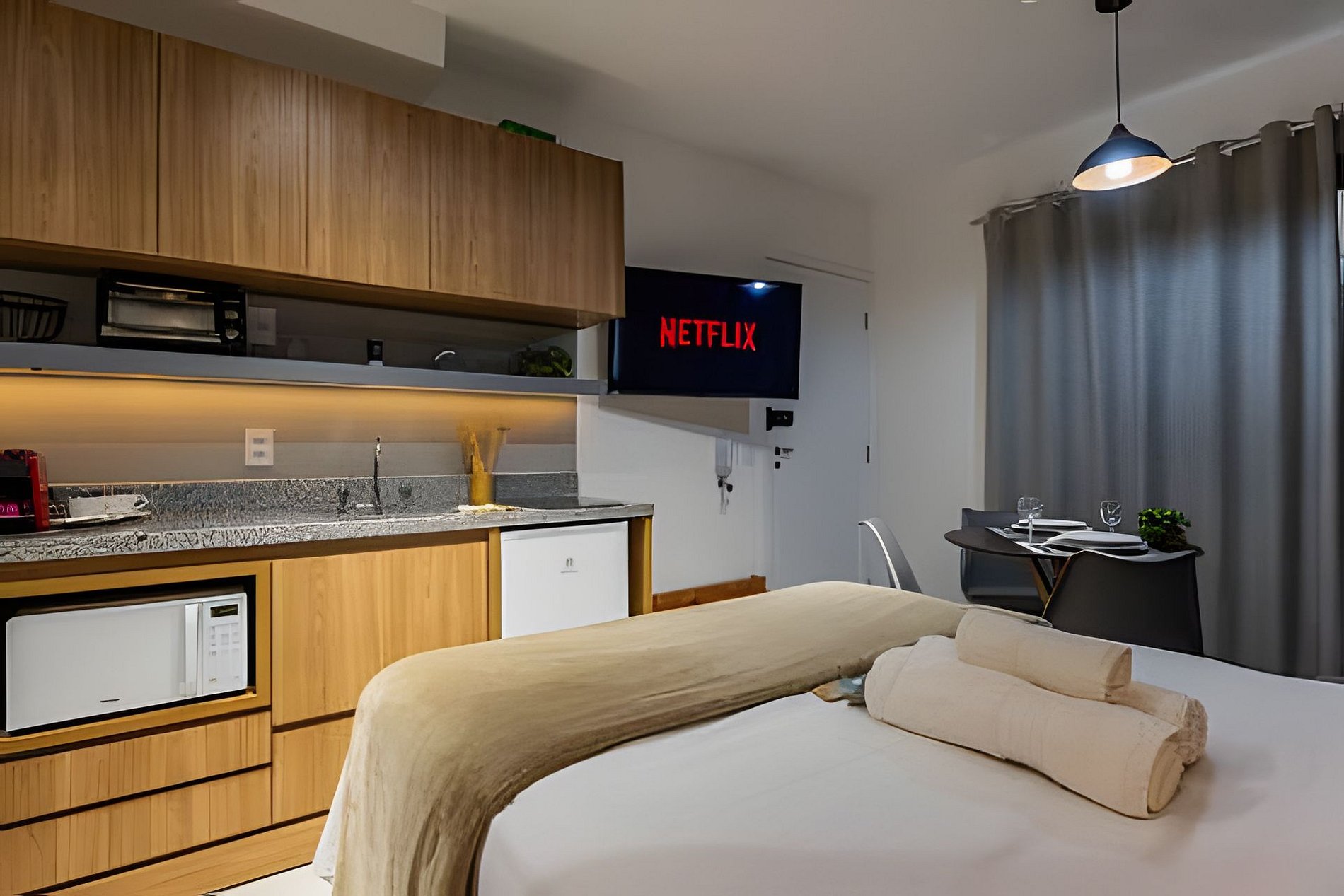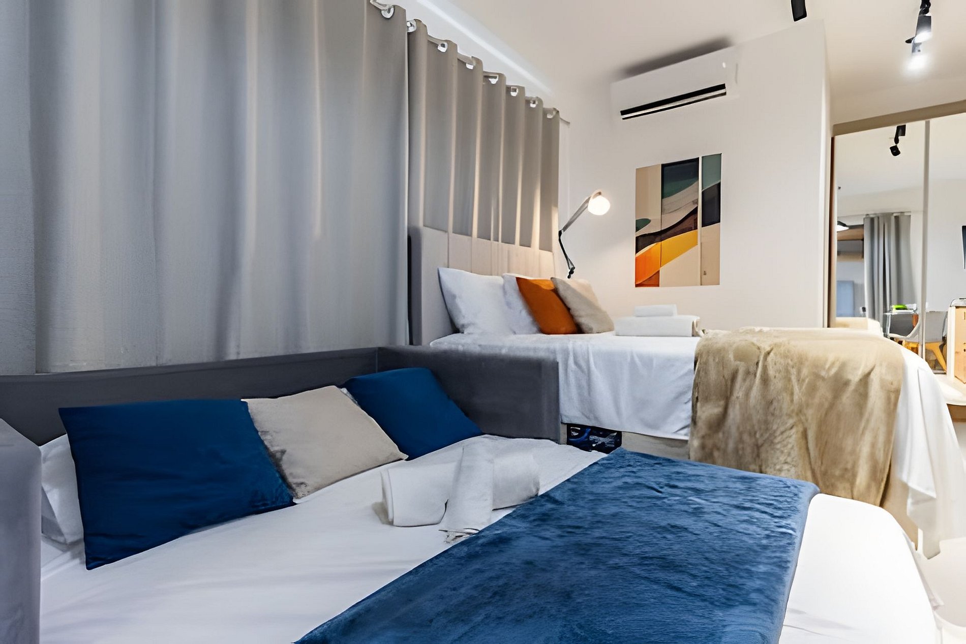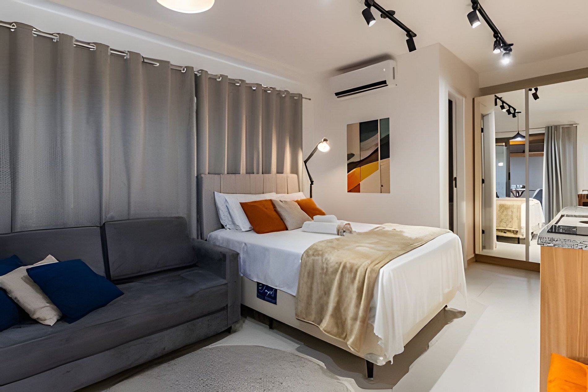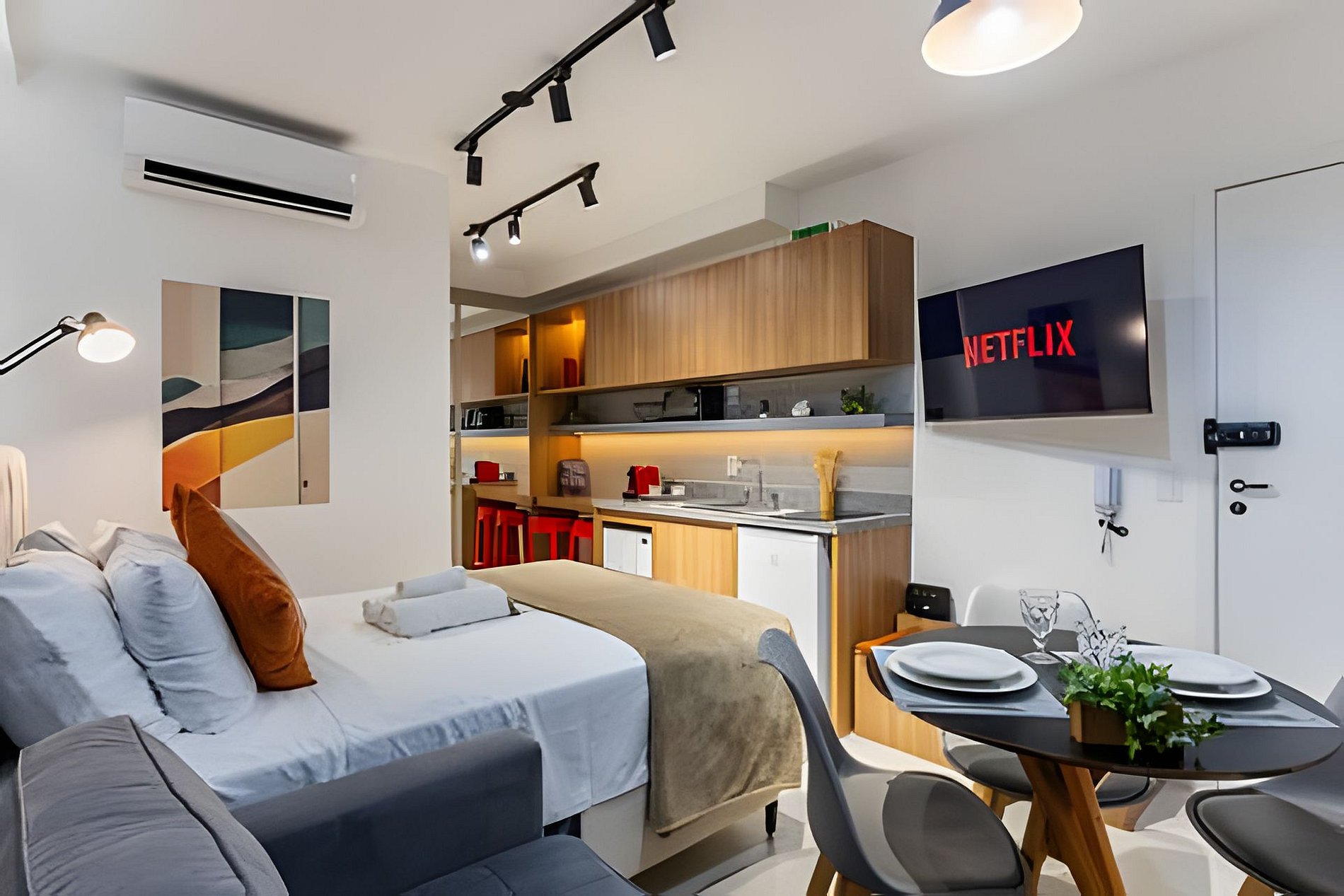 Nosso studio oferece a combinação perfeita de localização e conforto, a apenas 500m do Allianz Parque. Situado em um bairro vibrante, você estará perto de tudo que precisa, desde comércio até opções de lazer. O espaço é acolhedor, com ar-condicionado, Wi-Fi de alta velocidade e cozinha equipada. Aproveite as áreas comuns, incluindo piscina e academia. Traga suas malas e desfrute de uma estadia sem preocupações!