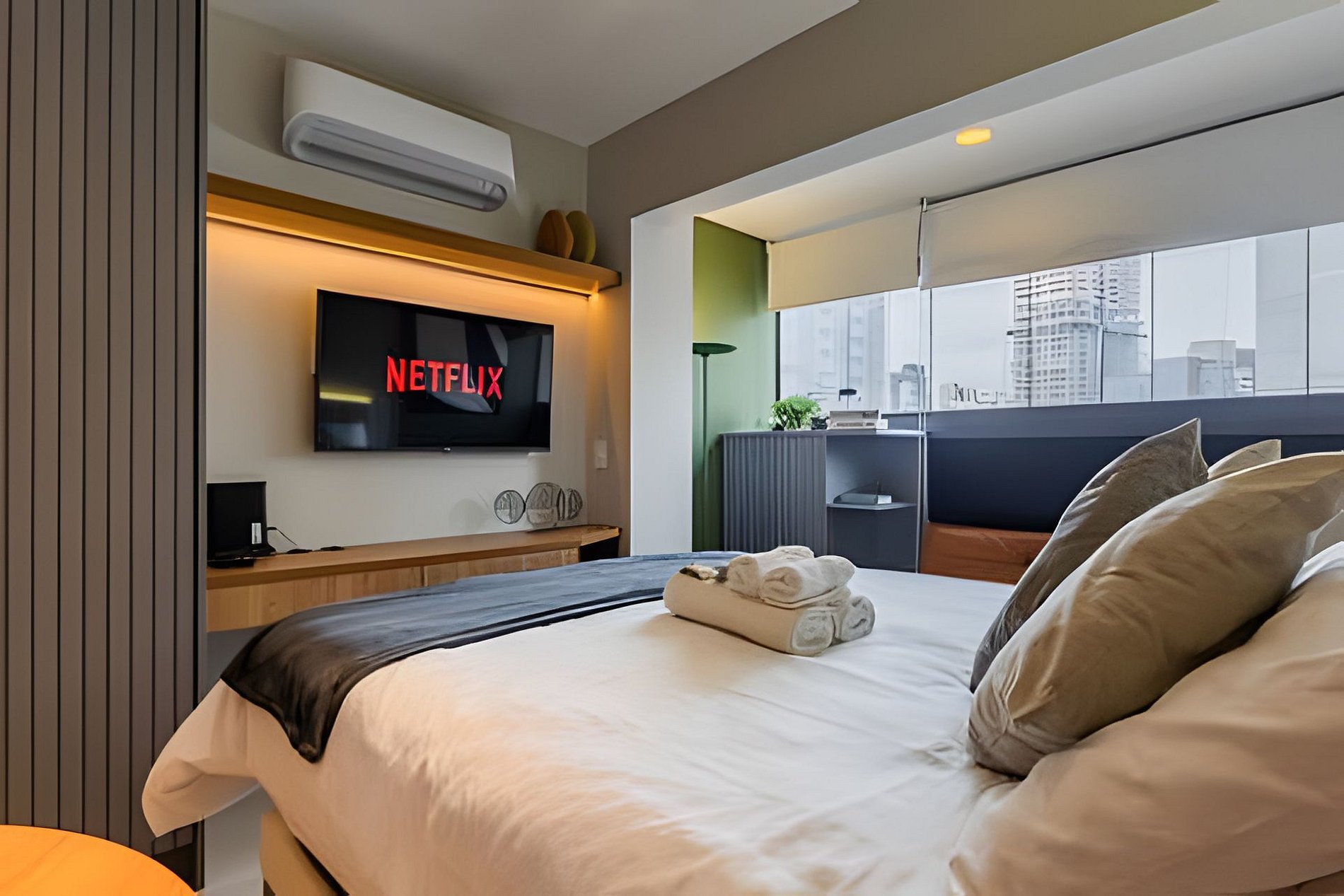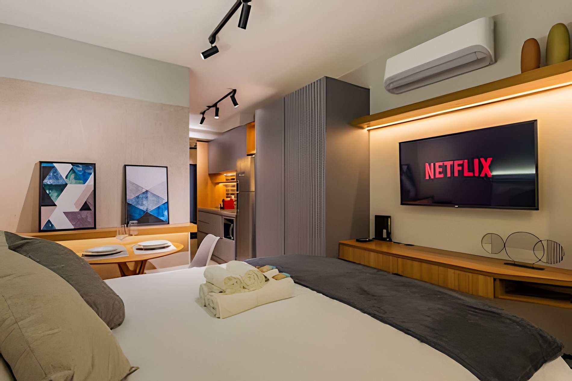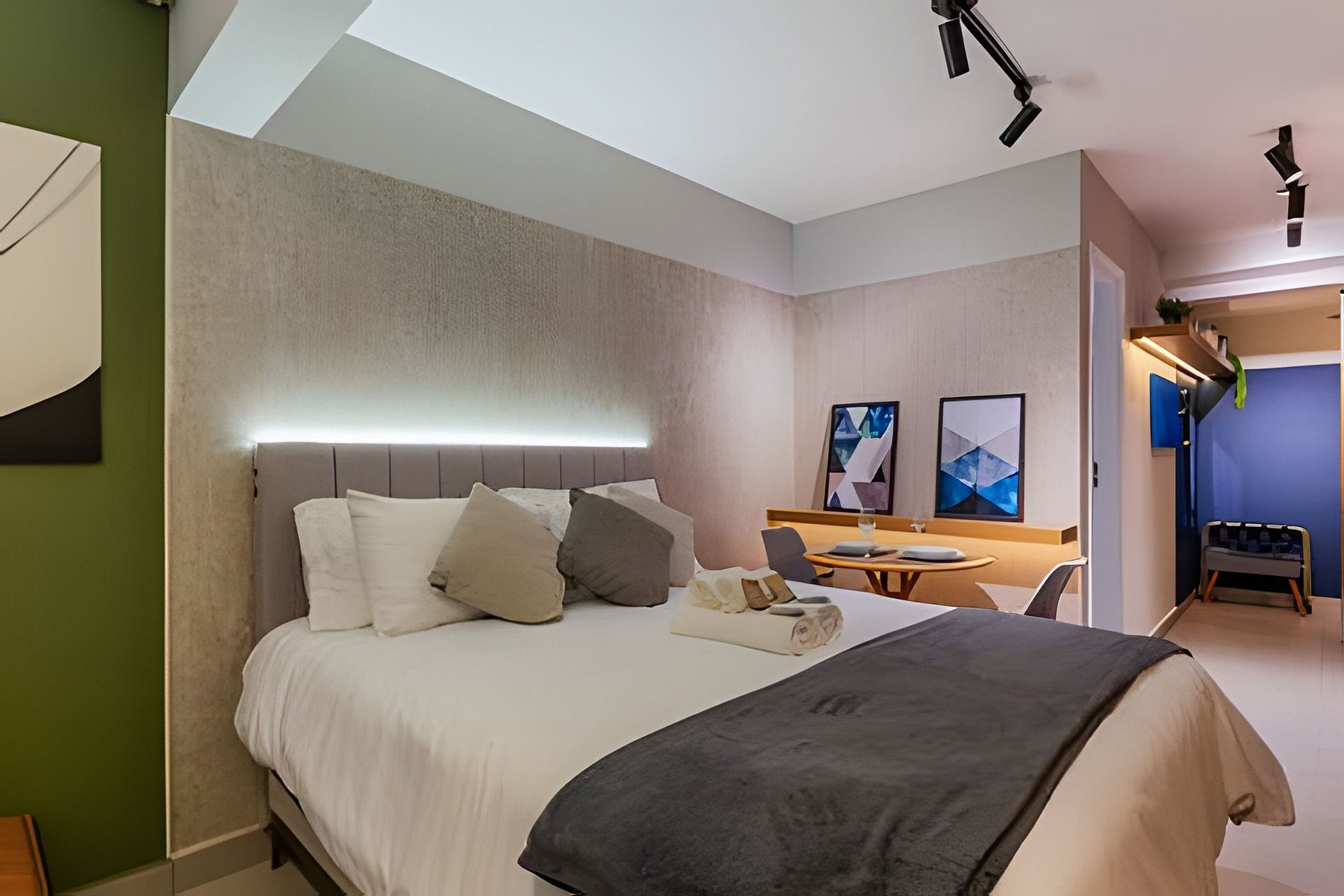 Nosso studio oferece a combinação perfeita de localização e conforto, a apenas 500m do Allianz Parque. Situado em um bairro vibrante, você estará perto de tudo que precisa, desde comércio até opções de lazer. O espaço é acolhedor, com ar-condicionado, Wi-Fi de alta velocidade e cozinha equipada. Aproveite as áreas comuns, incluindo piscina e academia. Traga suas malas e desfrute de uma estadia sem preocupações!