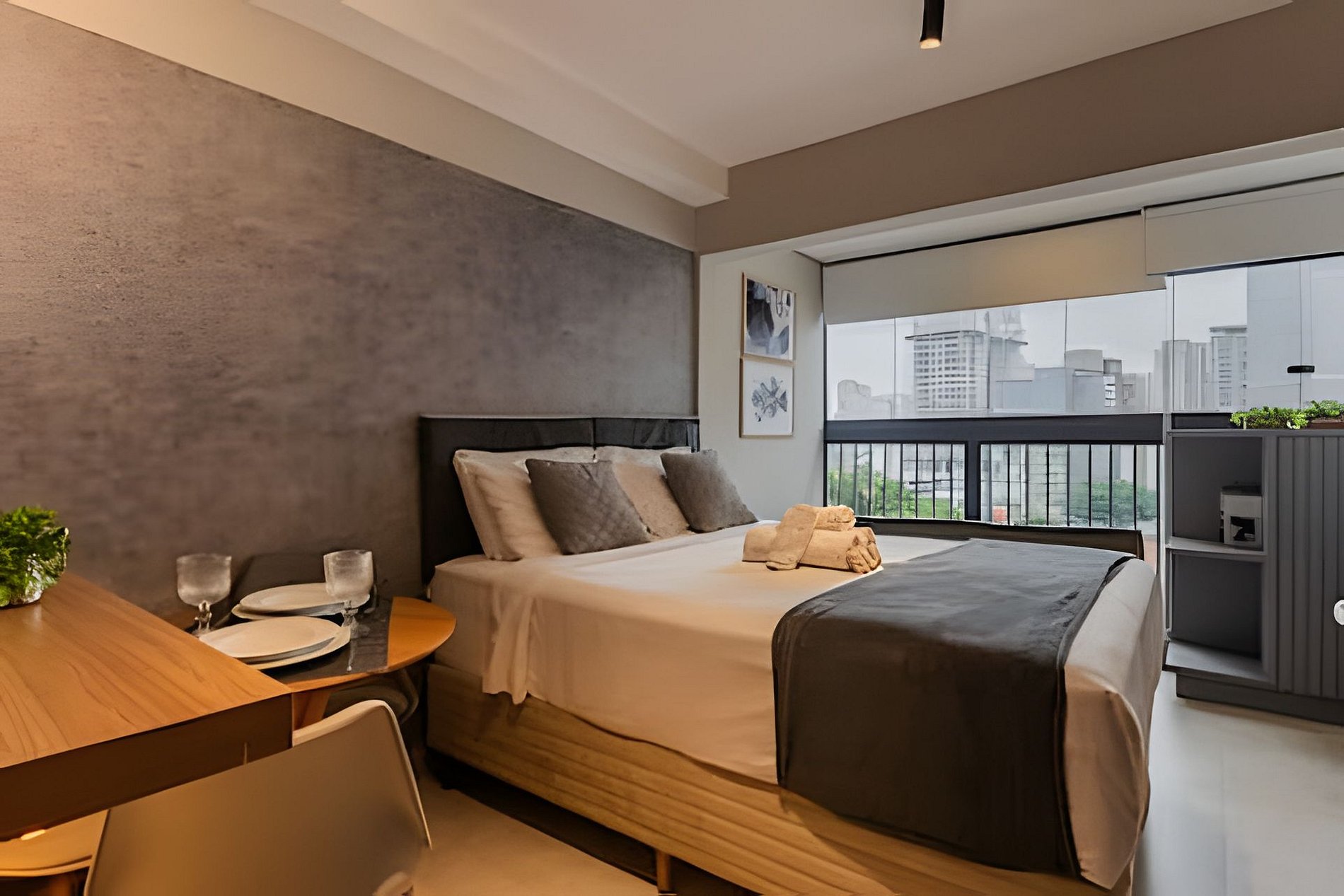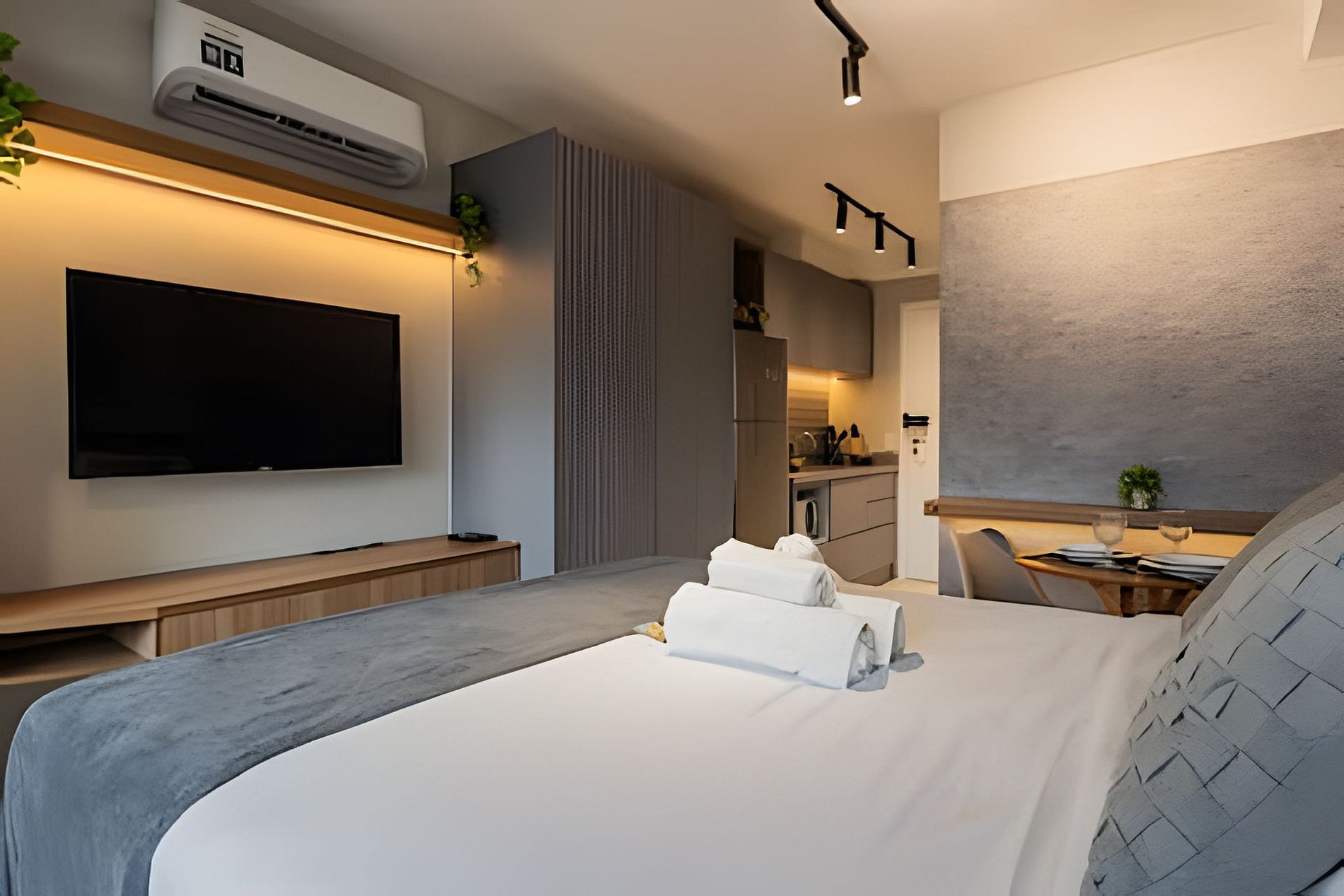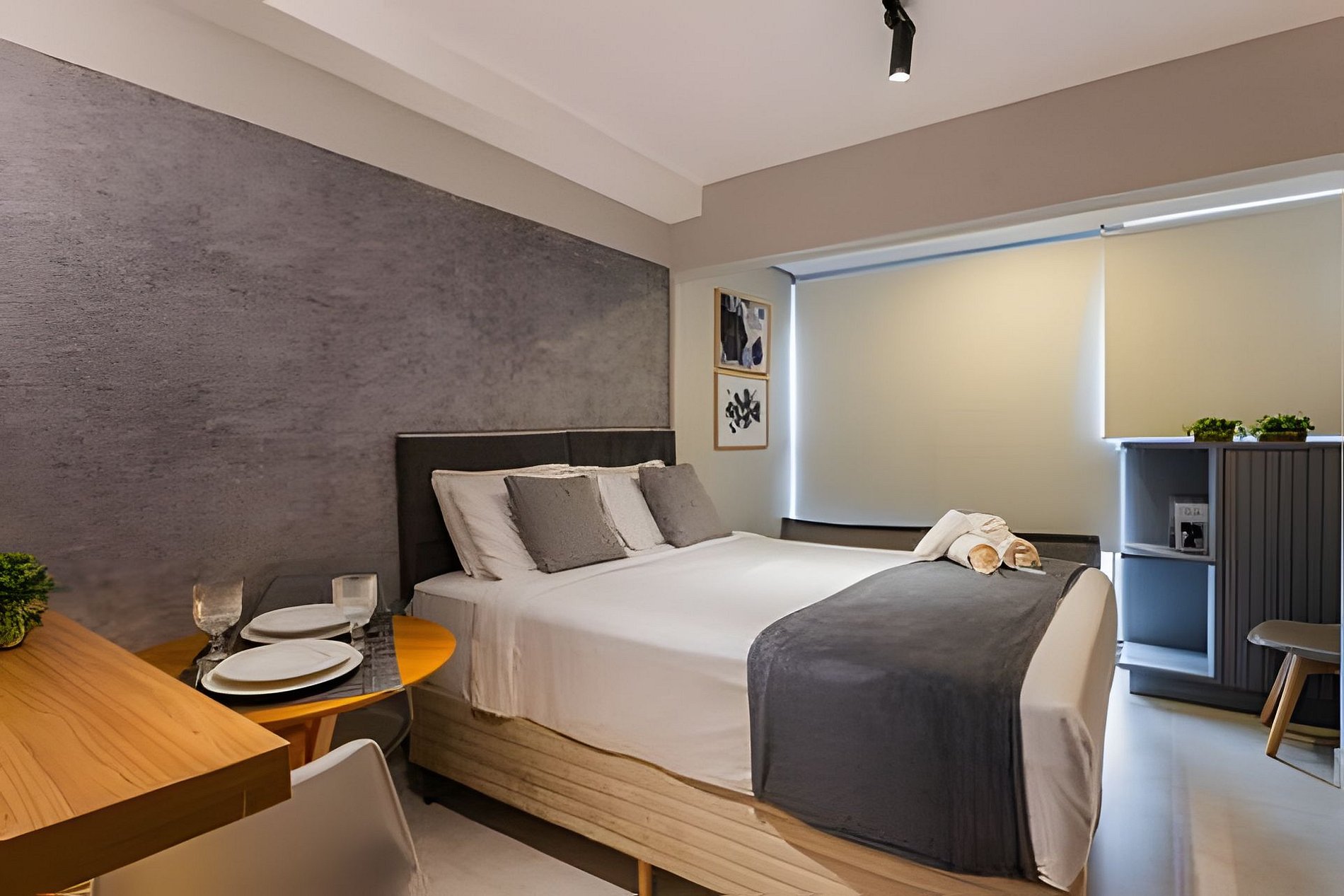 Nosso studio oferece a combinação perfeita de localização e conforto, a apenas 500m do Allianz Parque. Situado em um bairro vibrante, você estará perto de tudo que precisa, desde comércio até opções de lazer. O espaço é acolhedor, com ar-condicionado, Wi-Fi de alta velocidade e cozinha equipada. Aproveite as áreas comuns, incluindo piscina e academia. Traga suas malas e desfrute de uma estadia sem preocupações!