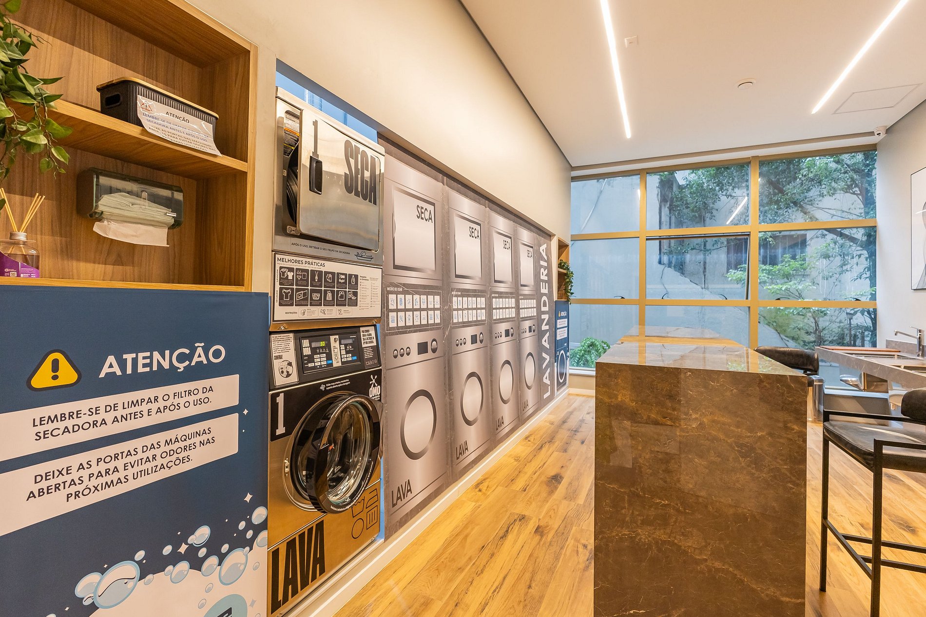 Praticidade sem abrir mão do charme. Nossa lavanderia é equipada com máquinas modernas, porque sabemos que os pequenos detalhes fazem toda a diferença na rotina de quem vive intensamente.