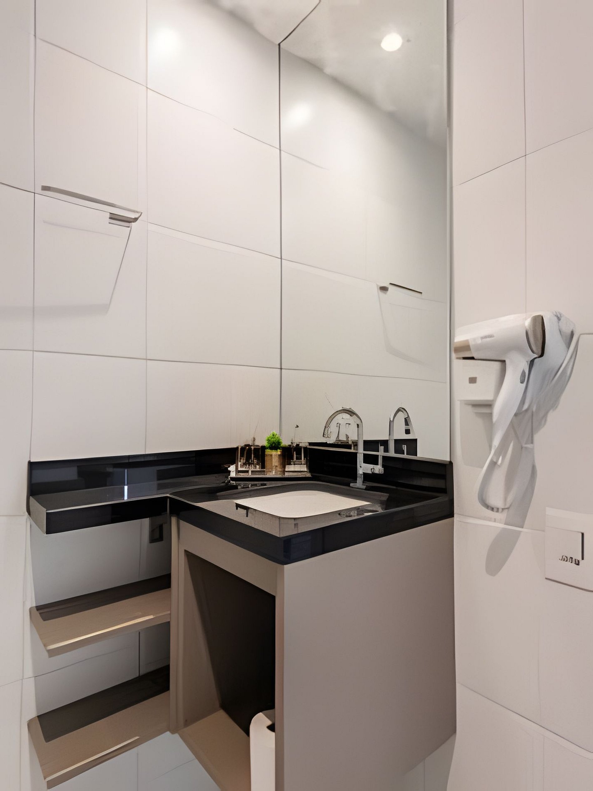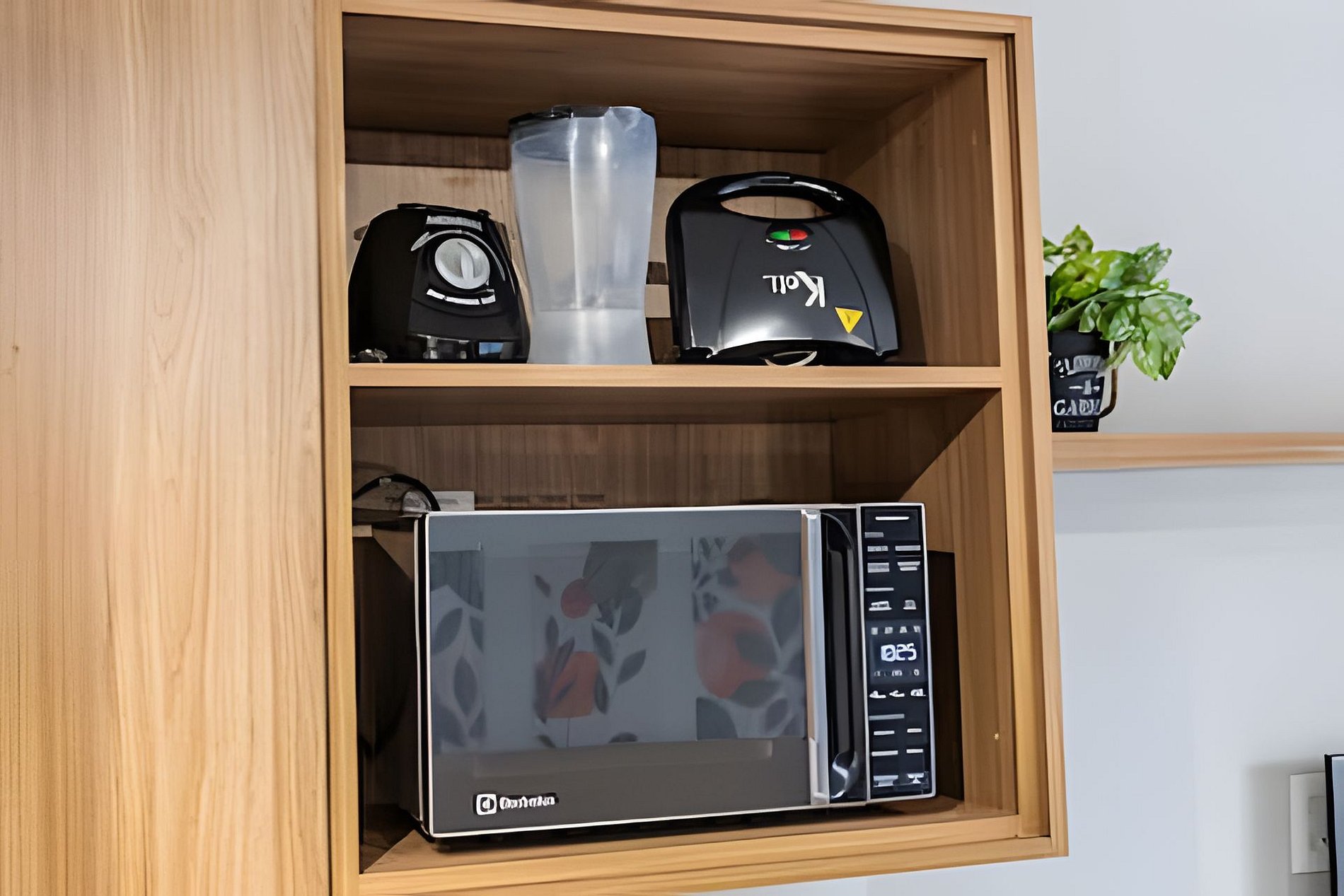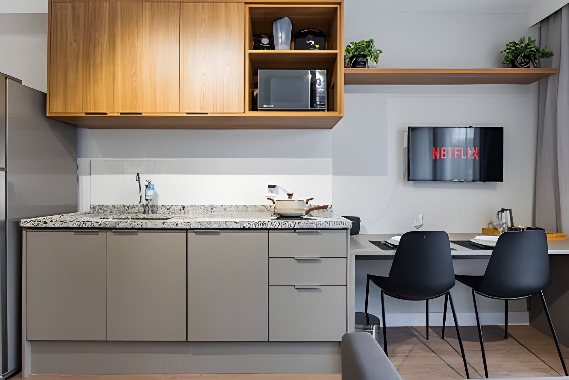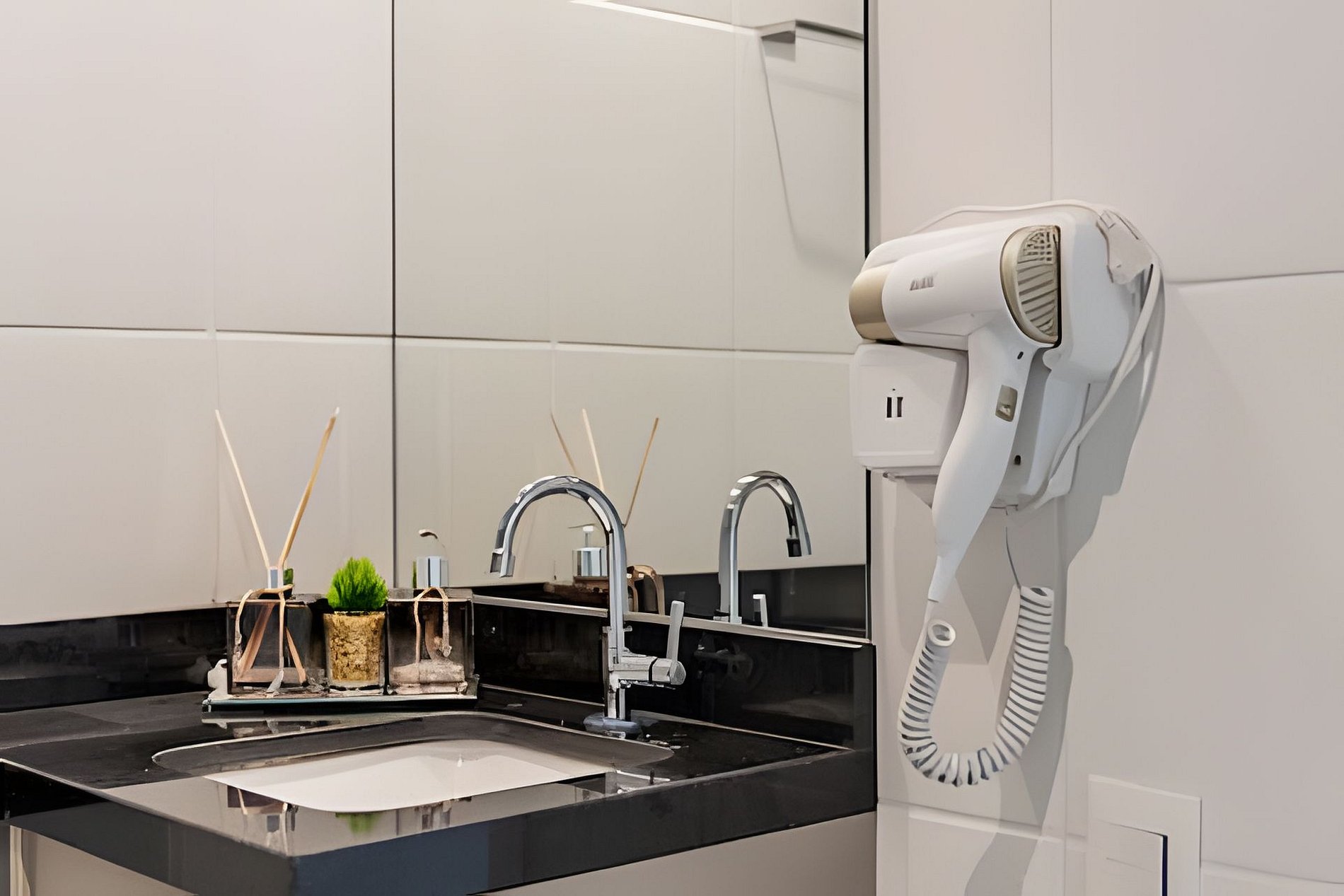 Conta com ar-condicionado, Smart TV, Wi-Fi, cozinha equipada, cafeteira, kit café/chá, secador e steamer para roupas.