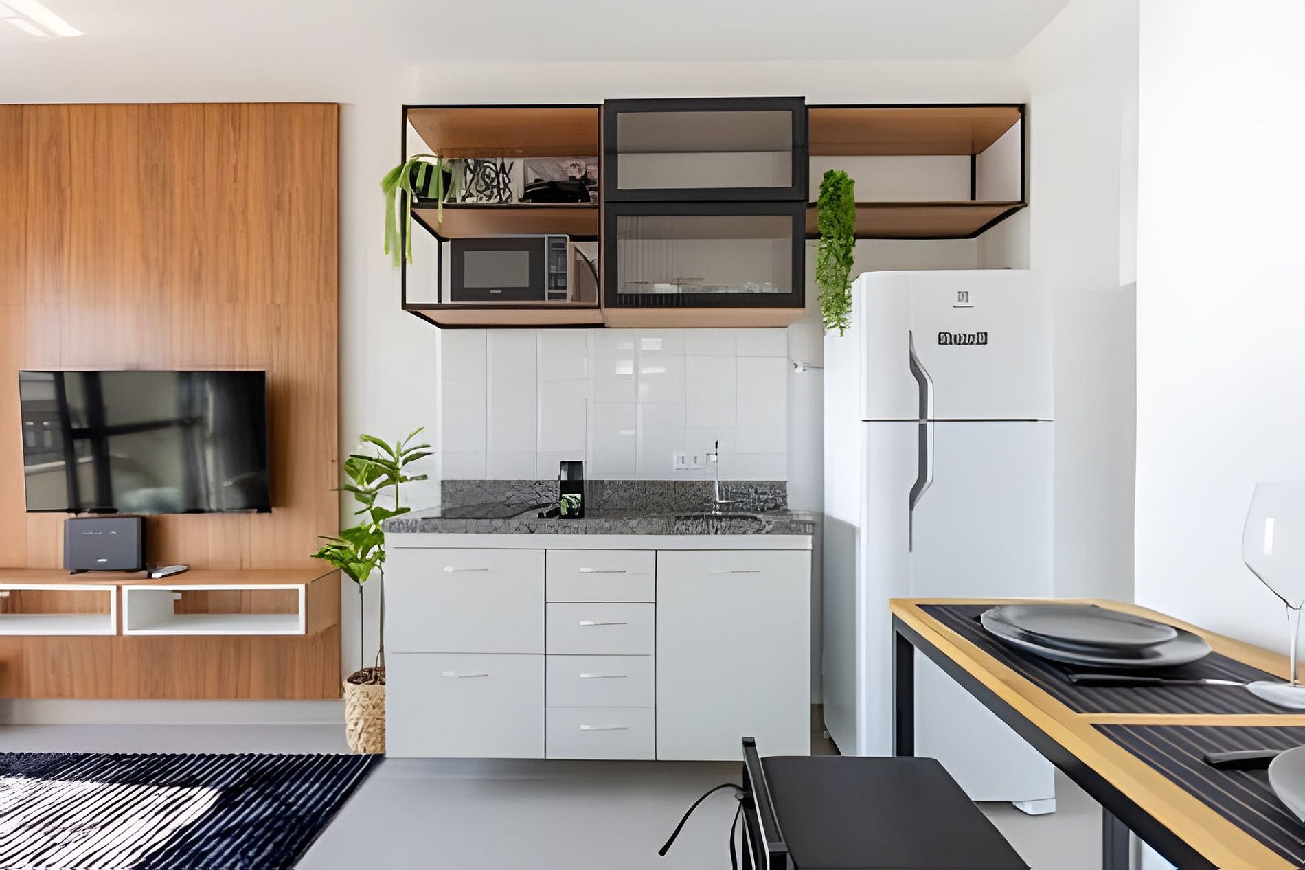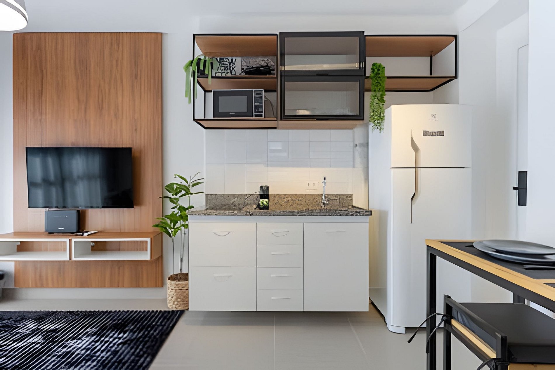 A cozinha é compacta e funcional, equipada com refrigerador, micro-ondas, fogão de indução e todos os utensílios essenciais para preparar refeições.
