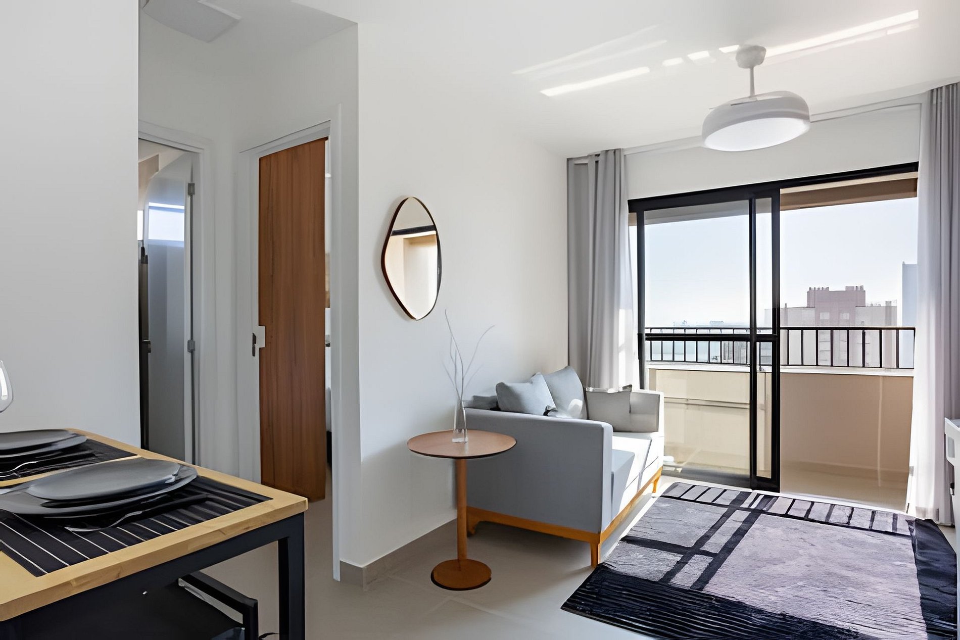 Aconchegante apartamento com vista privilegiada para o bairro, Quarto com cama de casal confortável e sala com sofá Moderno