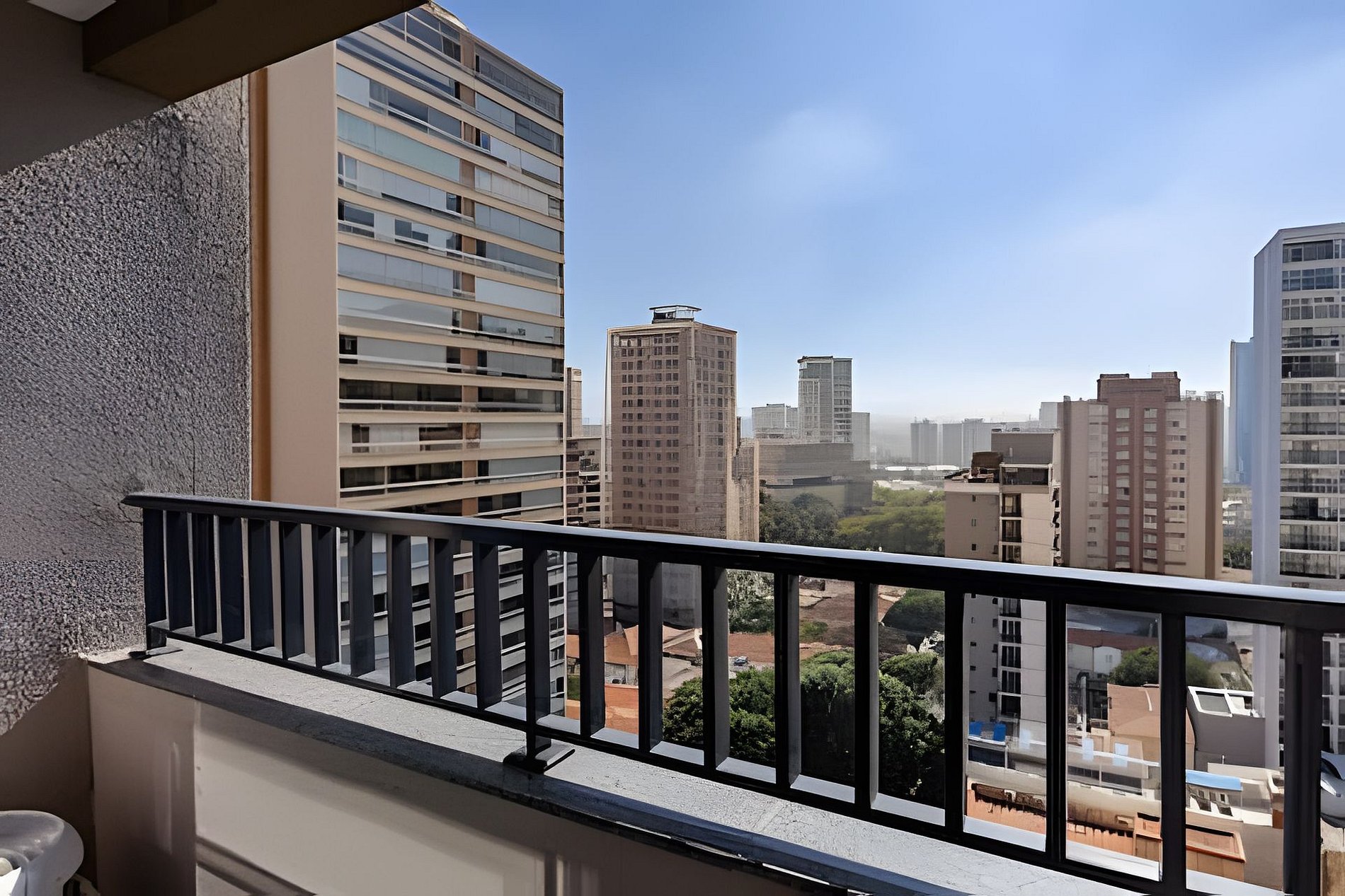 A varanda proporciona uma vista encantadora da cidade e área verde, perfeita para relaxar após um dia de passeios ou trabalho.