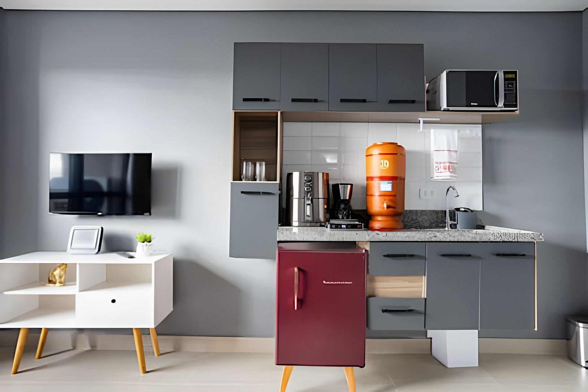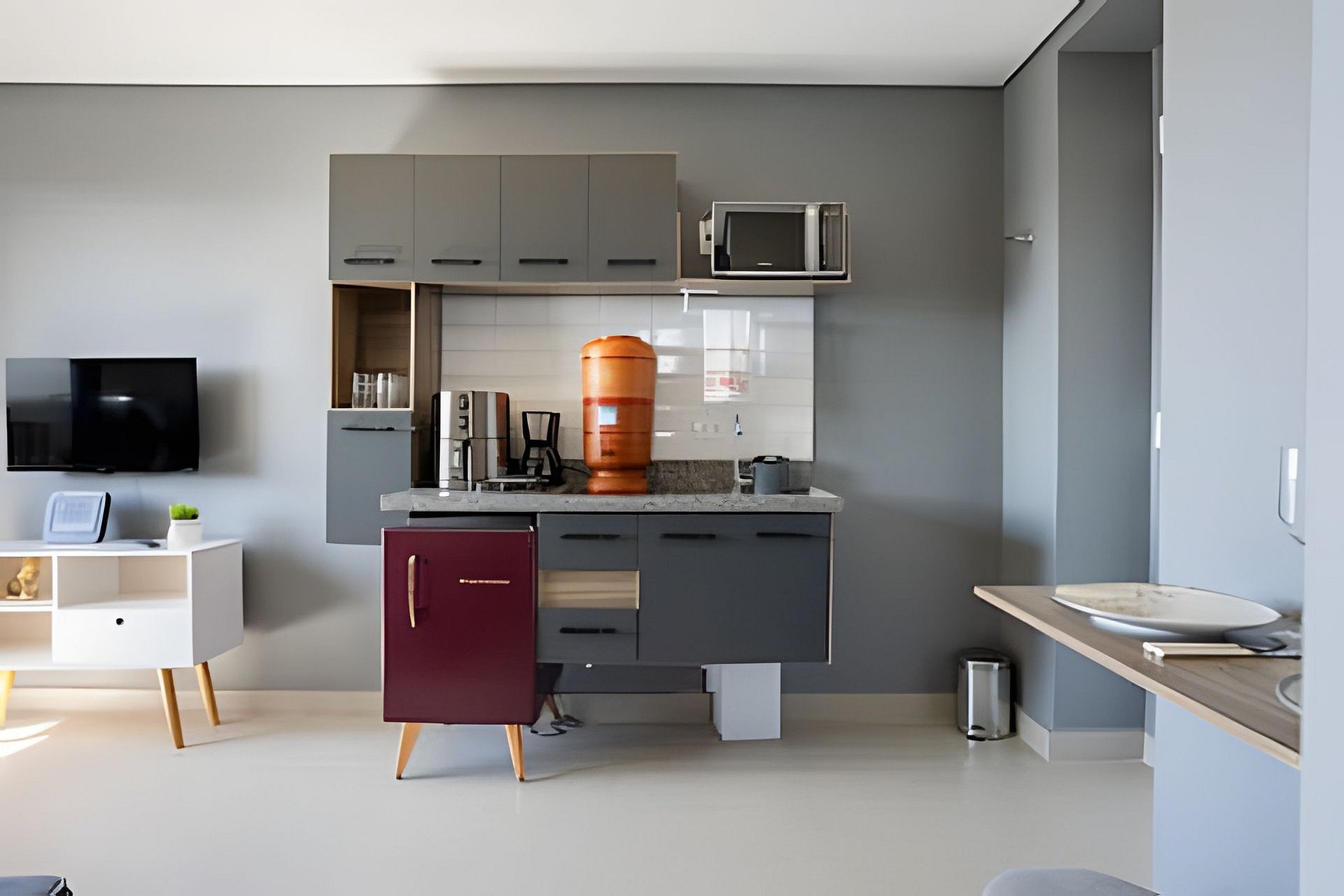 Cozinha completa com cafeteira, micro-ondas, fogão de indução, geladeira, sanduicheira e todos os utensílios essenciais.