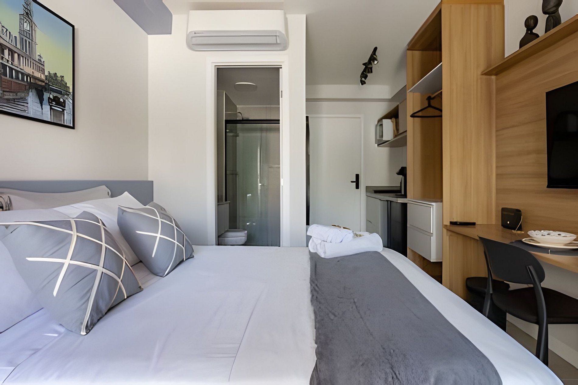 Nosso studio oferece a combinação perfeita de localização e conforto, a apenas 500m do Allianz Parque. Situado em um bairro vibrante, você estará perto de tudo que precisa, desde comércio até opções de lazer. O espaço é acolhedor, com ar-condicionado, Wi-Fi de alta velocidade e cozinha equipada. Aproveite as áreas comuns, incluindo piscina e academia. Traga suas malas e desfrute de uma estadia sem preocupações!